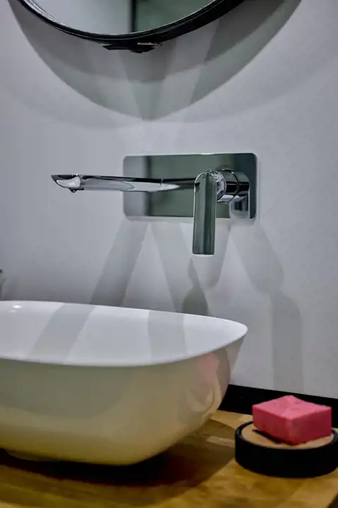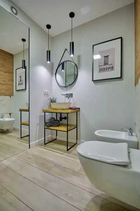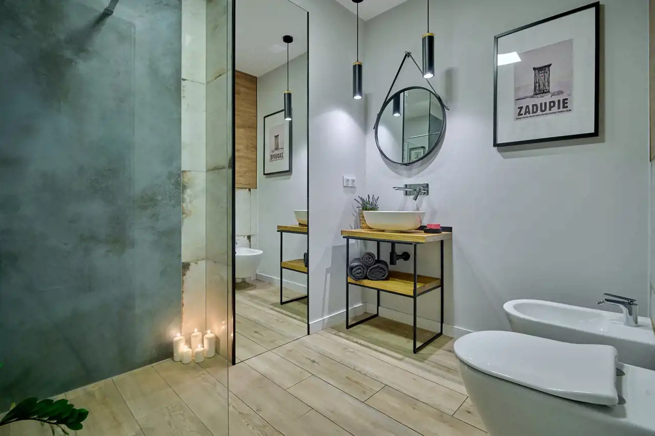 Stylowa łazienka (5,97 m2) z prysznicem typu walk-in i szybą RADAWAY MODO NEV II i płytą w łazience/pod prysznicem 119,5x239 CAESAR TRACE MINT, bateriami podtynkowymi, Villeroy & Boch Subway 2.0 zestaw - bidet i miska WC wisząca z DirectFlush z deską WC CeramicPlus Weiss Alpin i eleganckim oświetleniem, lustrem pionowym ściennym oraz wiszącym okrągłym nad umywalką. Na ścianach: GRESS TABLERO BEIGE 120X19 CERAMIKA LIMONE (wszystko w cenie)
