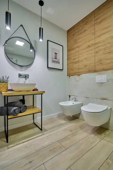 Podłogi wyłożone: GRESS TABLERO BEIGE 160X19 CERAMIKA LIMONE, a wszystkie drzwi wewnętrzne to nowoczesna Porta z ukrytymi zawiasami.