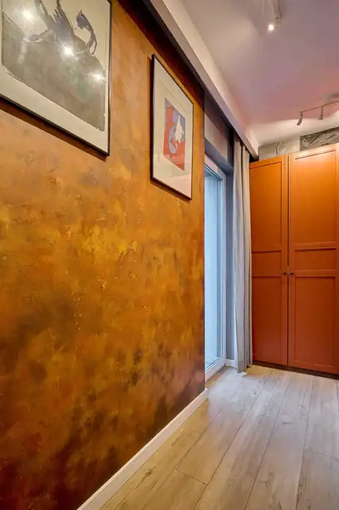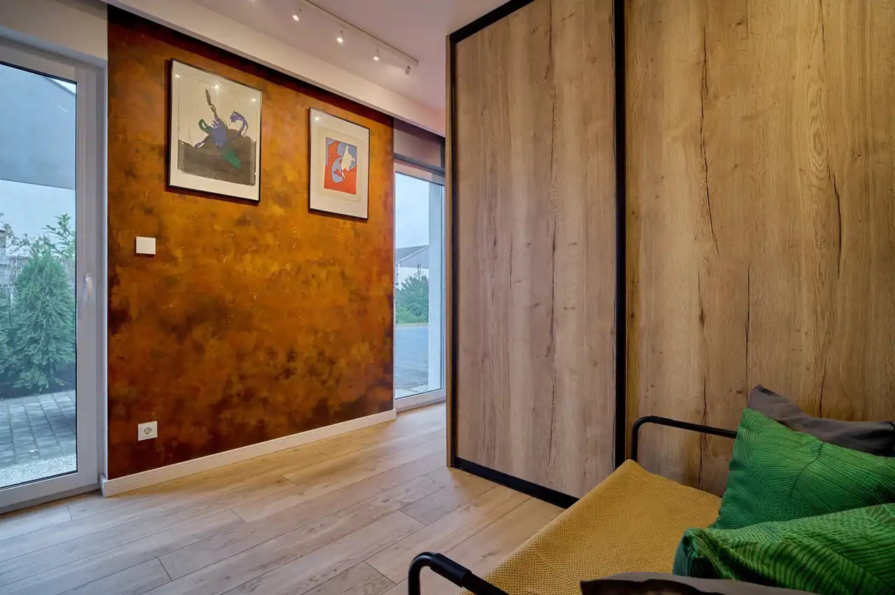 Pokój gościnny/garderoba (13,66 m2) z dwiema pojemnymi szafami i dekoracyjną ścianą w stylu loftowym - rdzawa. (w cenie szafy)