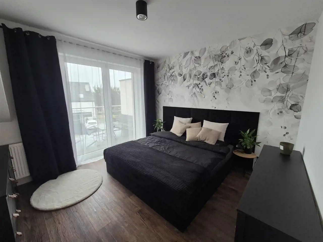 Strefa dzienna z nowoczesną kuchnią i wyjściem na taras.