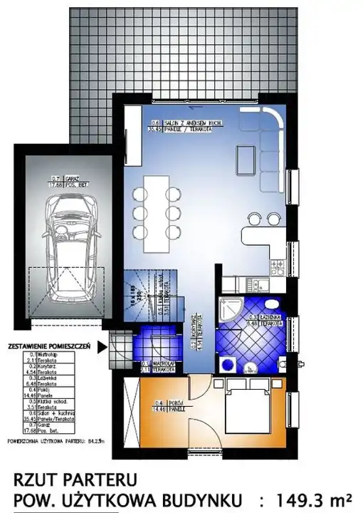 PARTER wiatrołap, hol z klatką schodową, pod schodami schowek, salon z aneksem kuchennym (z salonu wyjście na taras) w otwartej przestrzeni, łazienka z oknem, pokój/gabinet, GARAŻ,