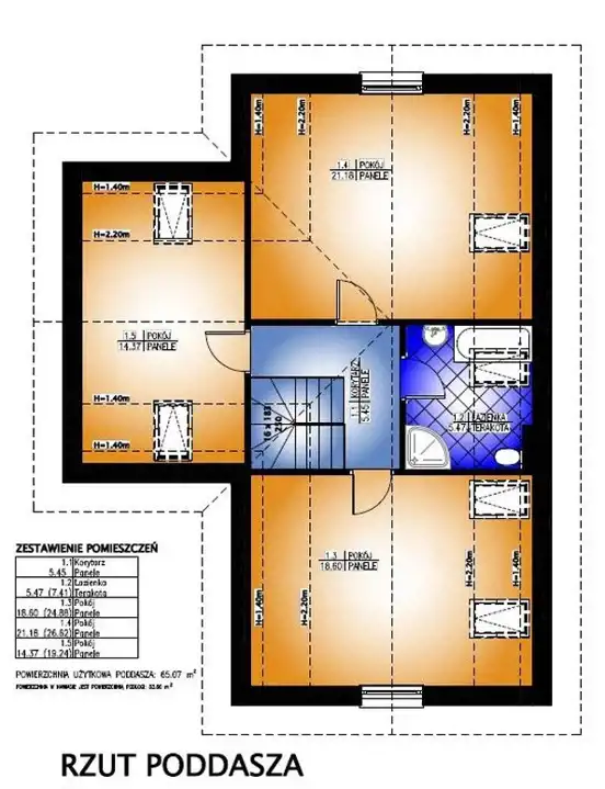 - PIĘTRO DOMU (poddasze): hol, 3 sypialnie, łazienka z oknem,