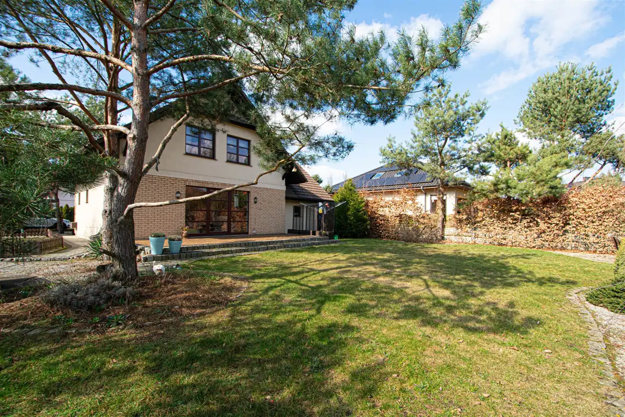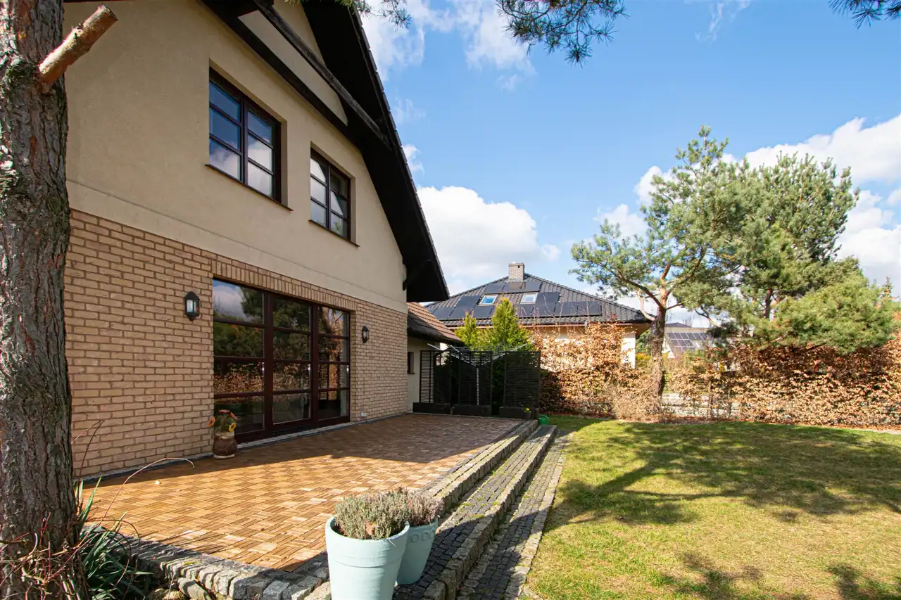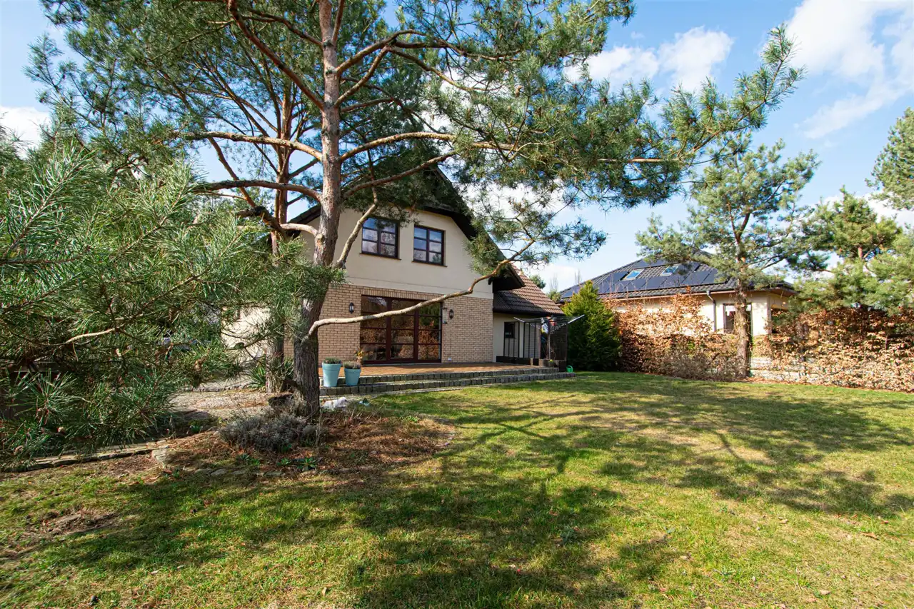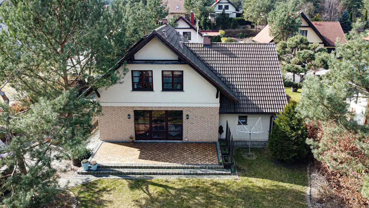 Dom słoneczny, otoczony zielenią, murowany w systemie tradycyjnym z 2011 roku, o ciekawej bryle z przestronnym tarasem, wyposażony w panele fotowoltaiczne oraz system alarmowy.