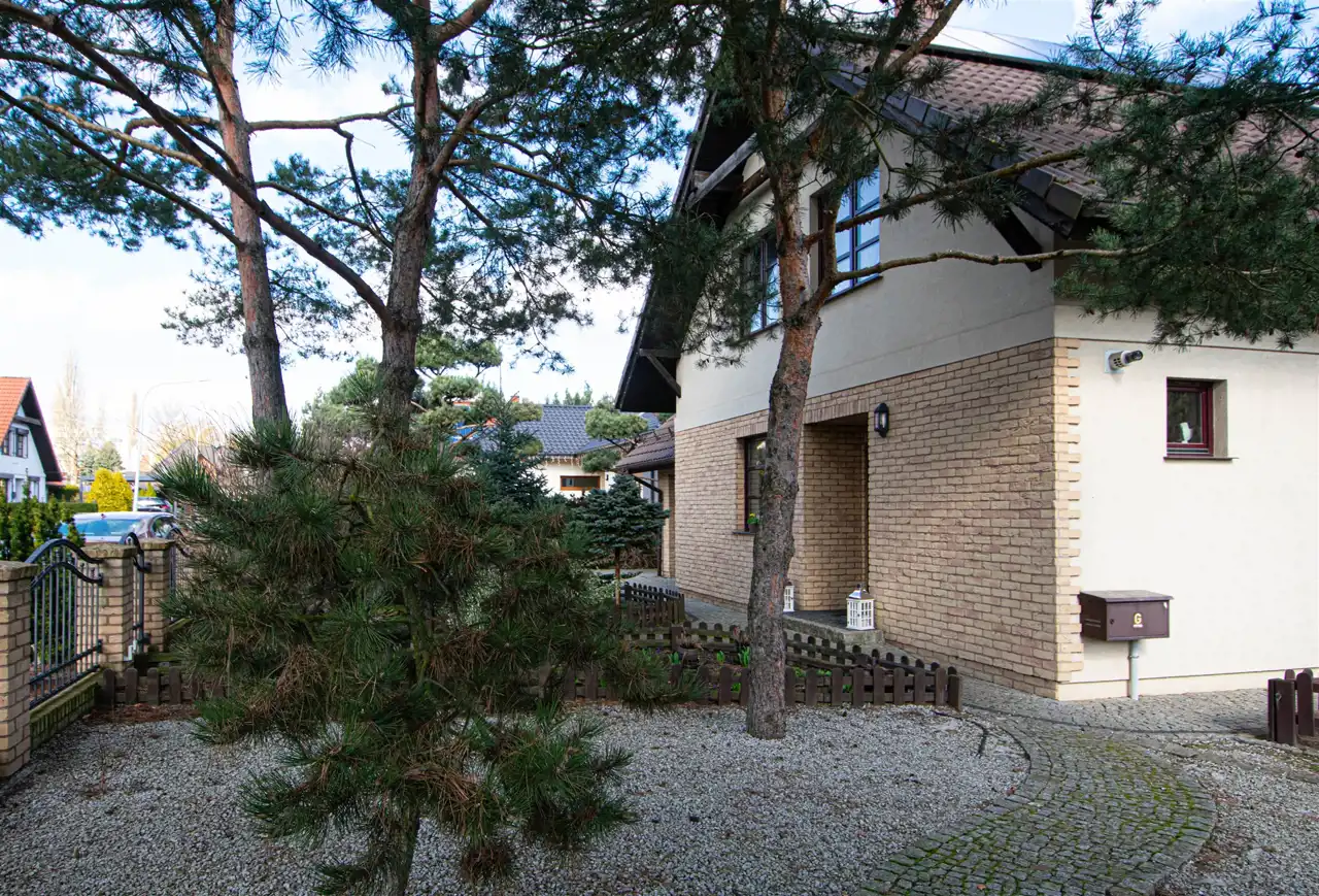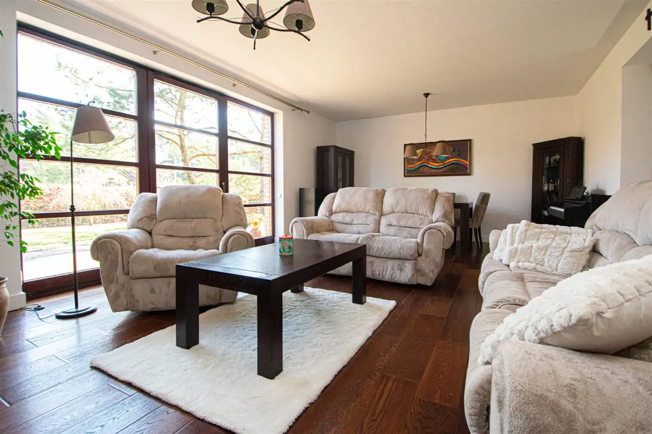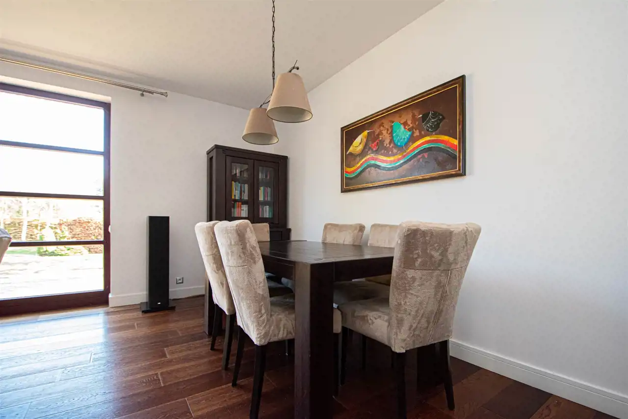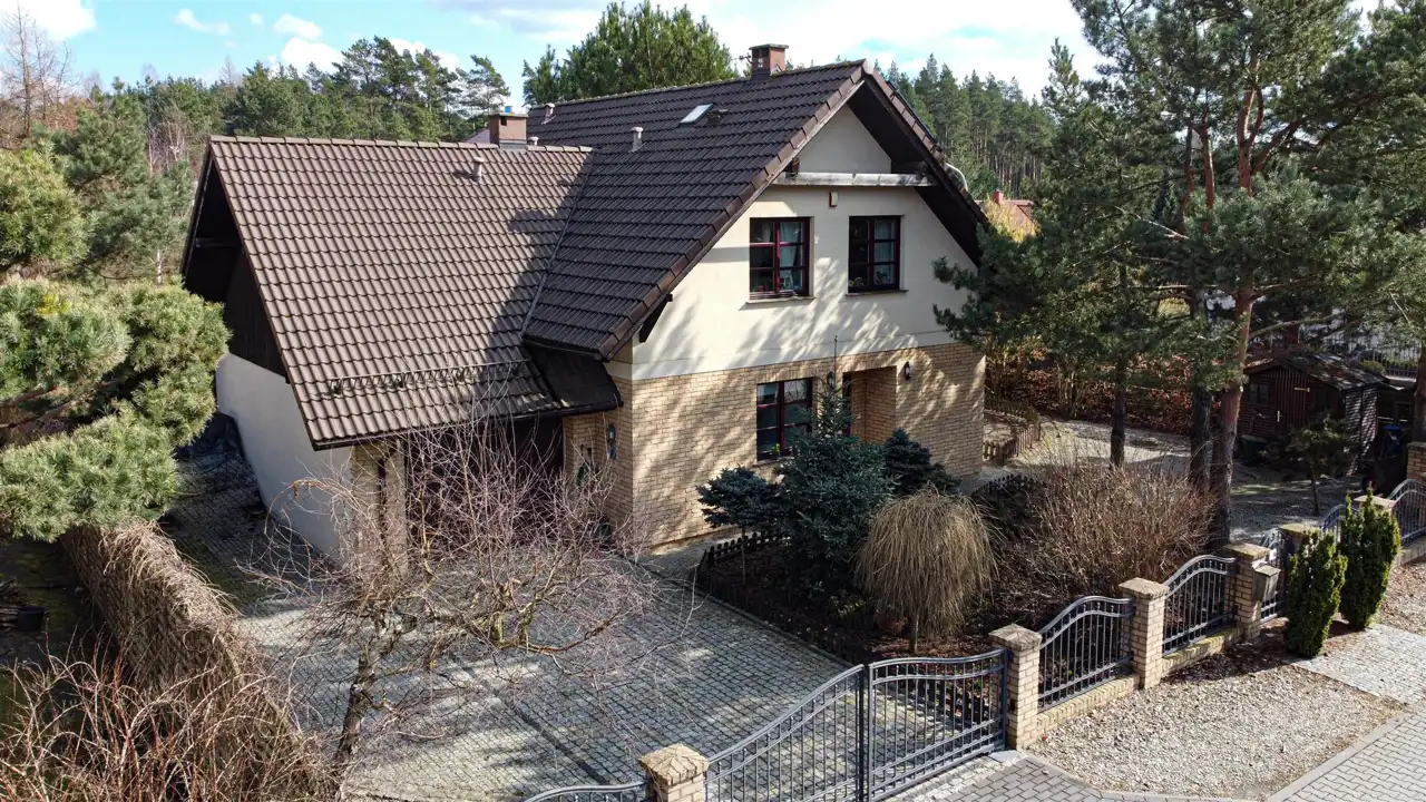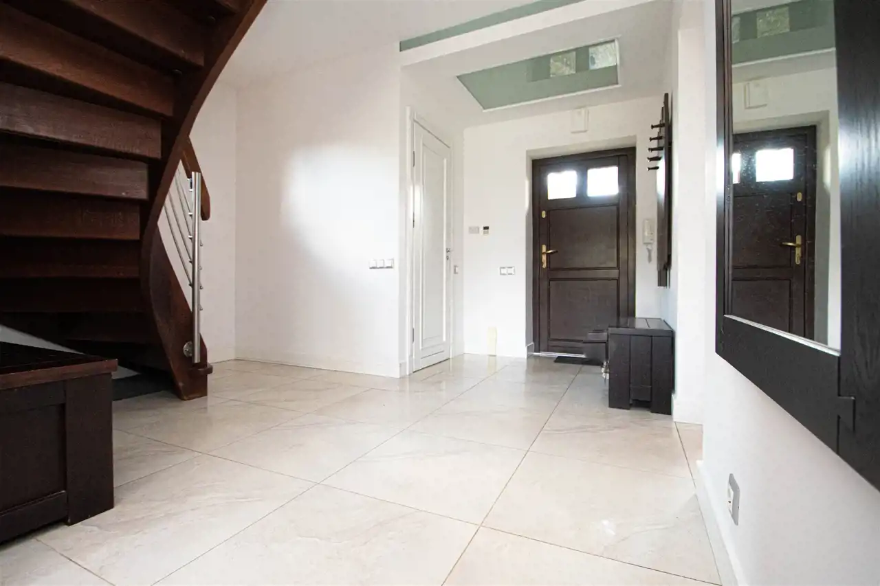 Powierzchnia użytkowa domu to 158,35 m2, z garażem w bryle budynku oraz z wejściem bezpośrednim z garażu do domu. Dom wykończony wysokiej jakości materiałami, słoneczny, otoczony zielenią, z pełną infrastrukturą techniczną. Na całej powierzchni domu ogrzewanie podłogowe, posadzki wyłożone gresem lub dębowymi deskami podłogowymi.