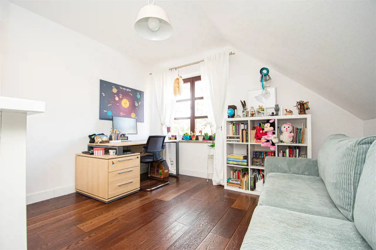 - pokój dzienny o pow. 34,47 m2 z wyjściem na taras oraz ogród;