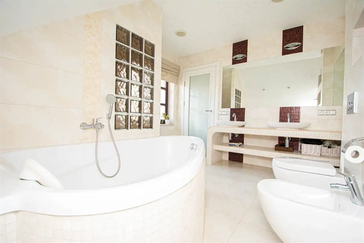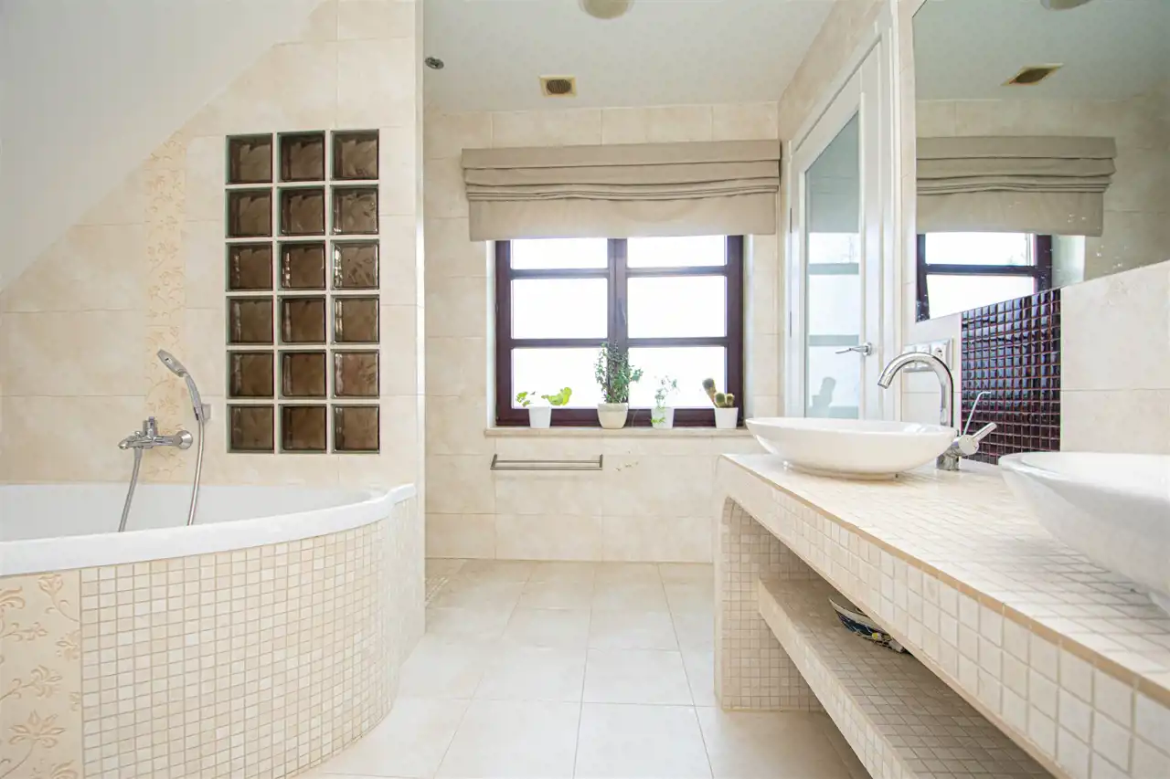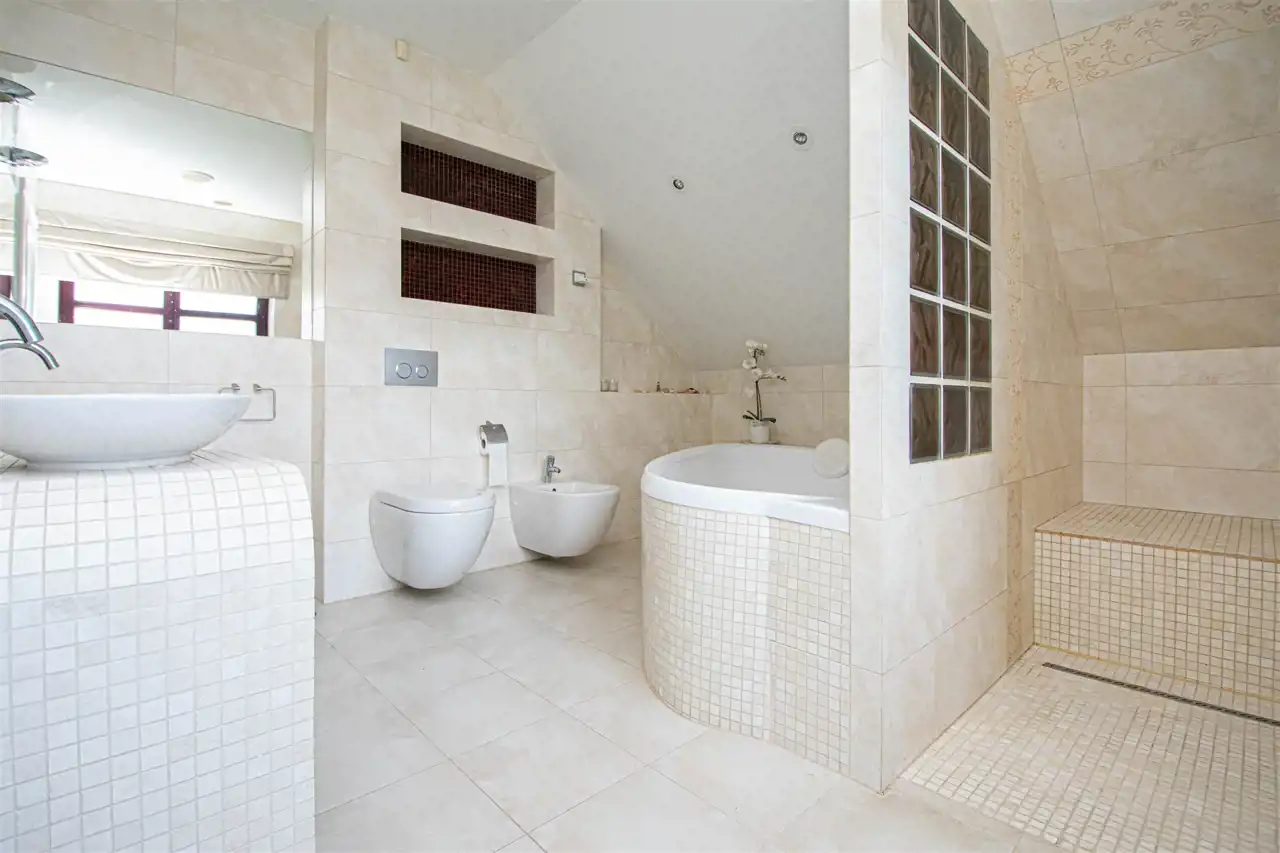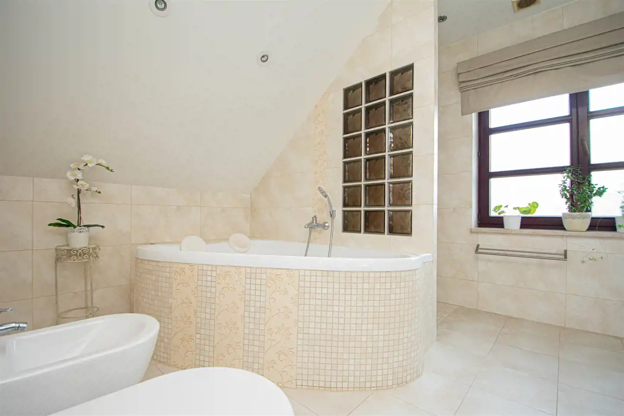 Pokój kąpielowy z oknem, wyposażony w wannę dwuosobową oraz natrysk.