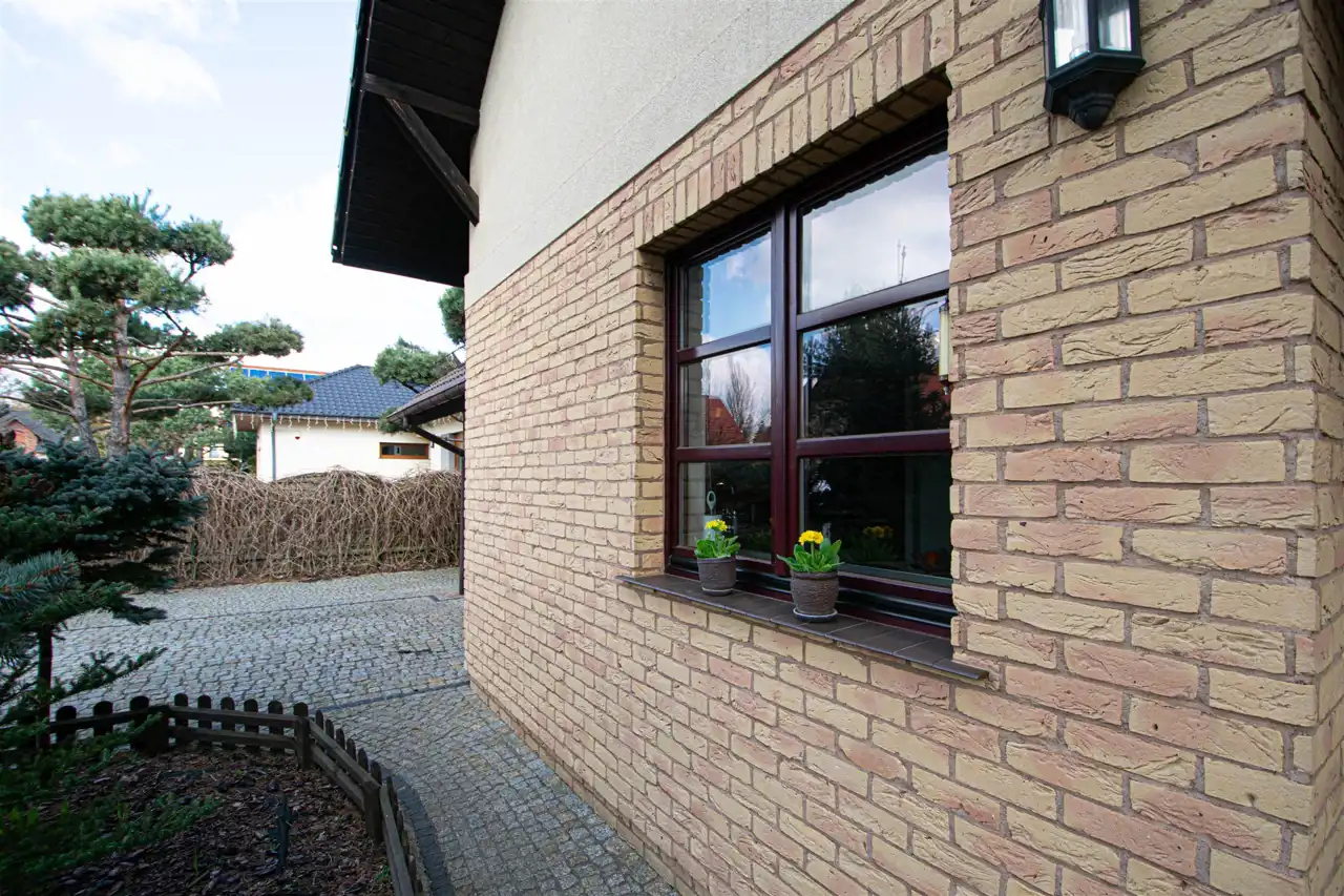 Budynek murowany, ściany zewnętrzne z betonu komórkowego gr. 36.5cm i 30 cm, ocieplony styropianem, elewacja wykonana tynkiem szlachetnym oraz klinkierem.