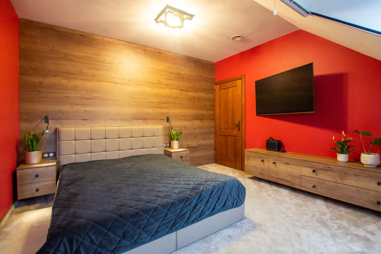 Na piętrze ogrzewanie podłogowe w korytarzu, łazience i garderobie. W sypialniach grzejniki.