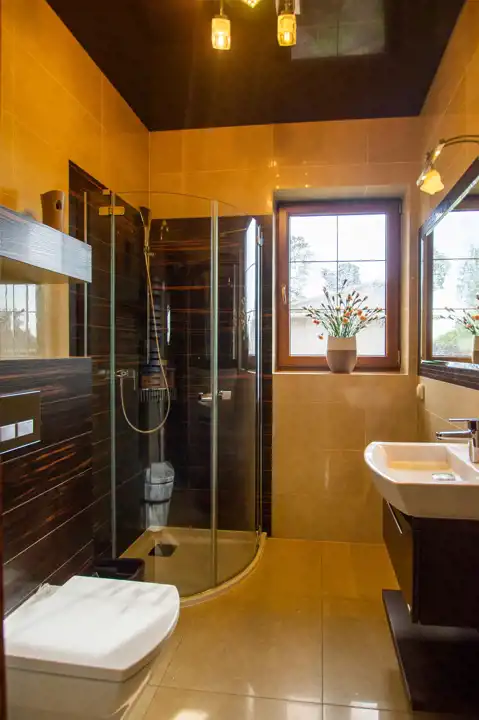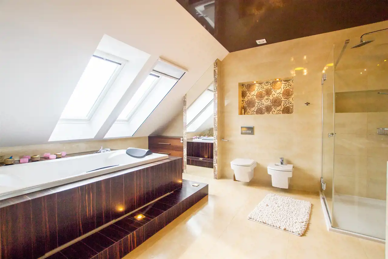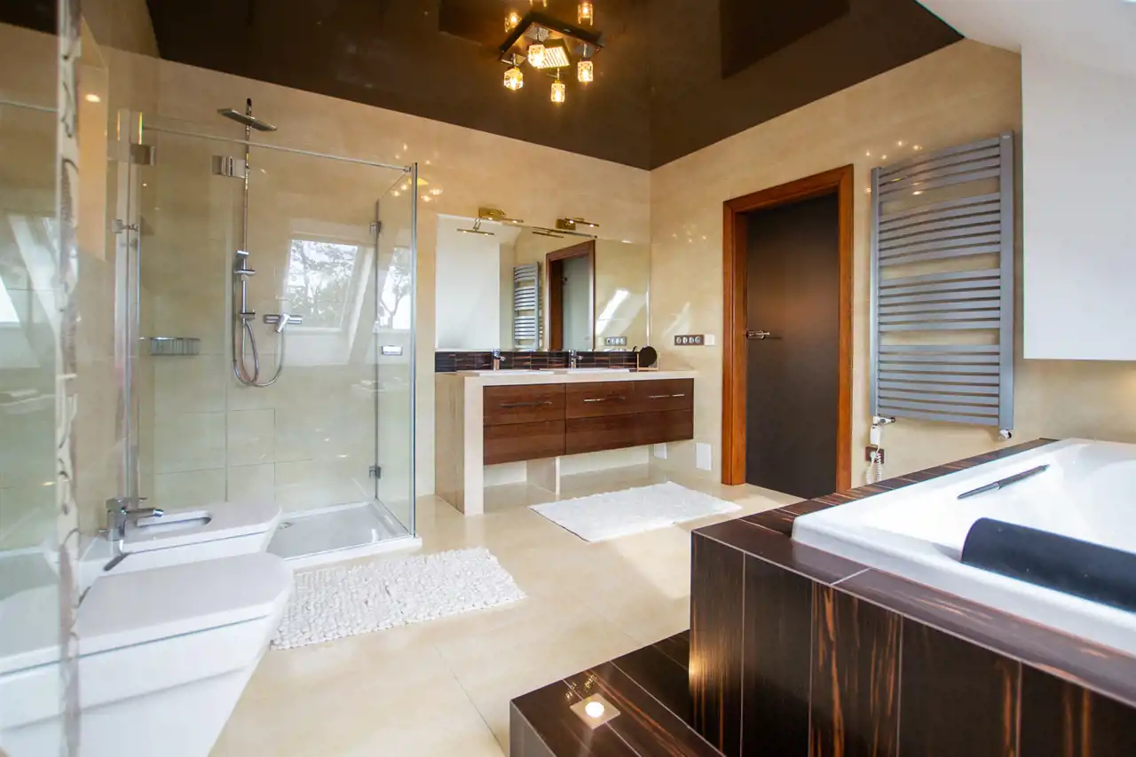 W łazience dodatkowo ogrzewanie podłogowe elektryczne i grzejnik drabinka z grzałką elektryczną.