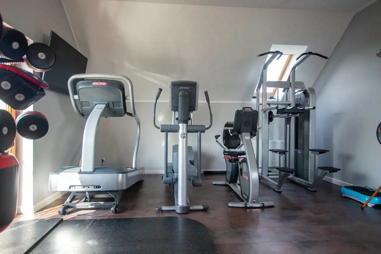 Na parterze za łazienką przechodzimy do części, w której jest garaż dwustanowiskowy o pow. 46 m2 i pralnia, a schodami na górę wchodzimy do części rekreacyjnej z siłownią i sauną fińską oraz dodatkową łazienką.