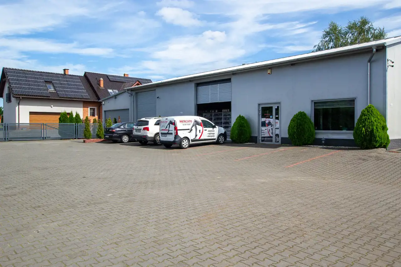 W przedniej części działki mamy hale garażową o pow. 327 m2 ( 261m2 plus 66 m2 garaż), która dzięki odrębnemu parkingowi i dodatkowej bramie może funkcjonować całkowicie niezależnie od części mieszkalnej. Hala o wysokości 5,8 m ma na dole biuro i łazienkę, a na górze zaplecze socjalne (drugie biuro, dodatkowa łazienka, przebieralnia). Wymiary bram: 1 - wysokość - 410cm i szerokość 335 cm, 2 - wysokość 410 cm i szerokość 355cm