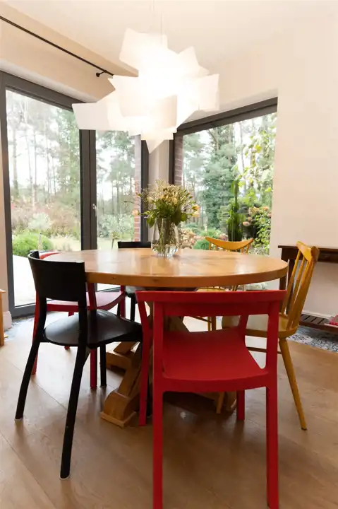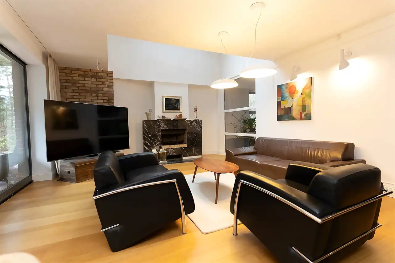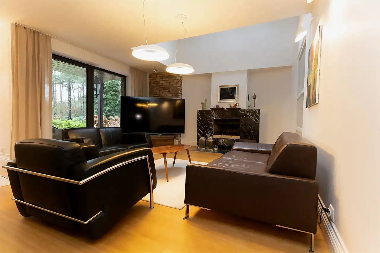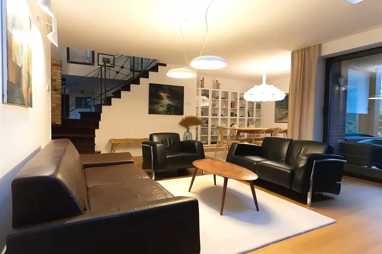 Na parterze o przemyślanym, funkcjonalnym układzie od wejścia wita przestronny salon z kominkiem, ciepły, przytulny i pełen charakteru. Salon z częścią jadalnianą. Salon stanowi serce domu – przestrzeń spotkań i odpoczynku. Z salony wyjścia na jeden z tarasów - idealne miejsce do spędzania wolnego czasu przy porannej kawie lub spotkań z bliskimi przy wspólnym posiłku.