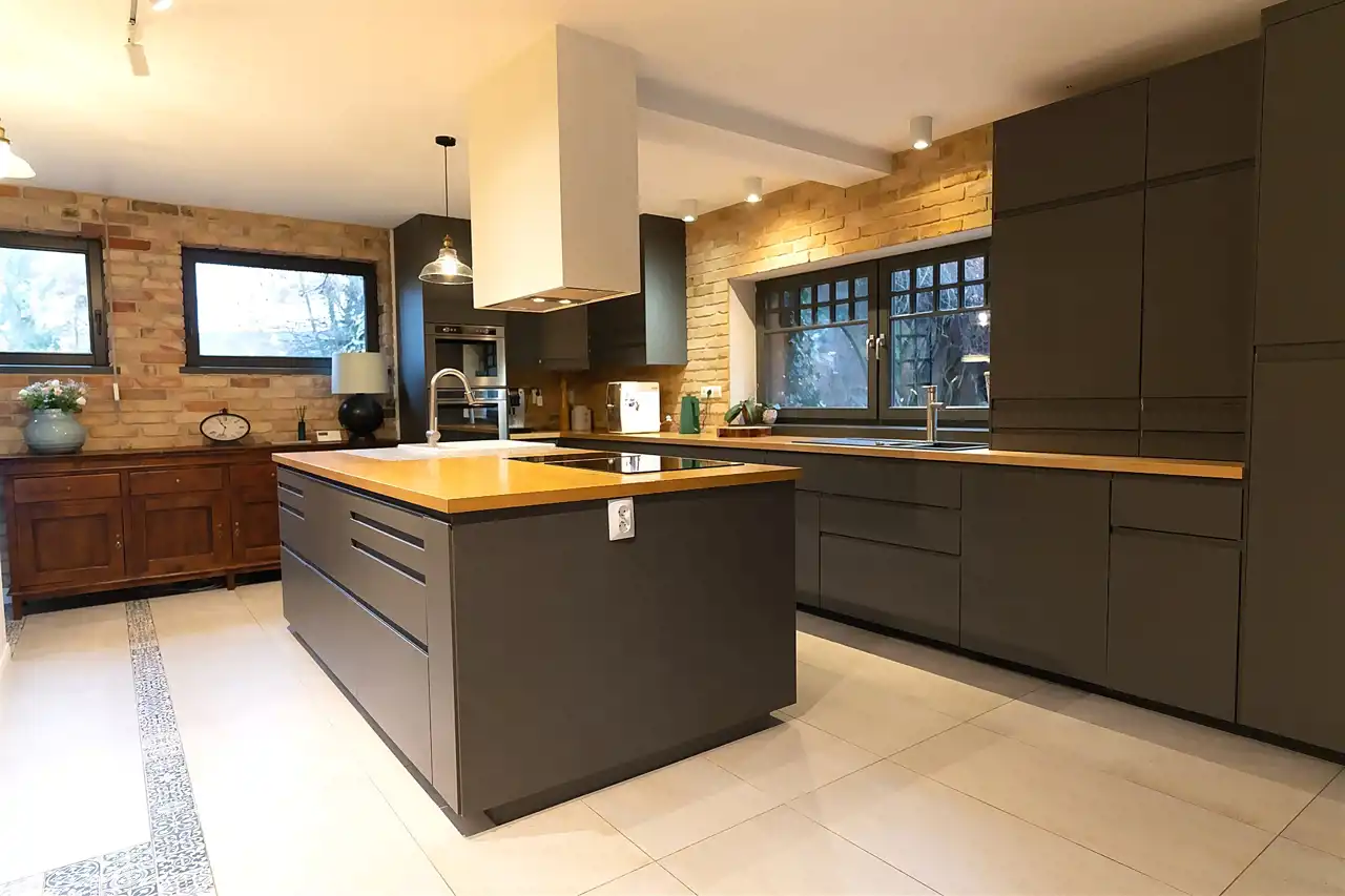 Wyjątkowa kuchnia z jadalnią. W tej kuchni gotowanie staje się przyjemnością a nie codzienną koniecznością. Kuchnia wyposażona w piękną i funkcjonalną wyspę. Zabudowa kuchenna ze wszystkim niezbędnymi sprzętami i wieloma miejscami do przechowywania, Kącik jadalniany z pięknym widokiem na ogród i wyjściem na taras.