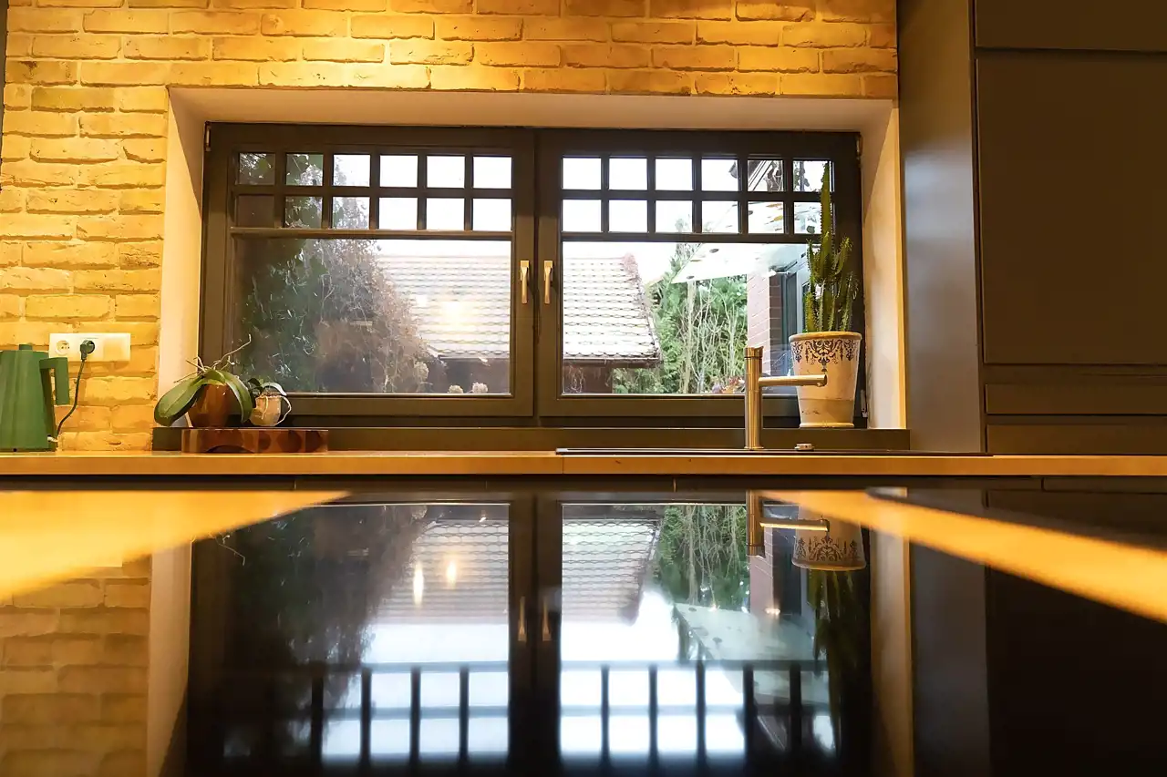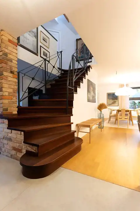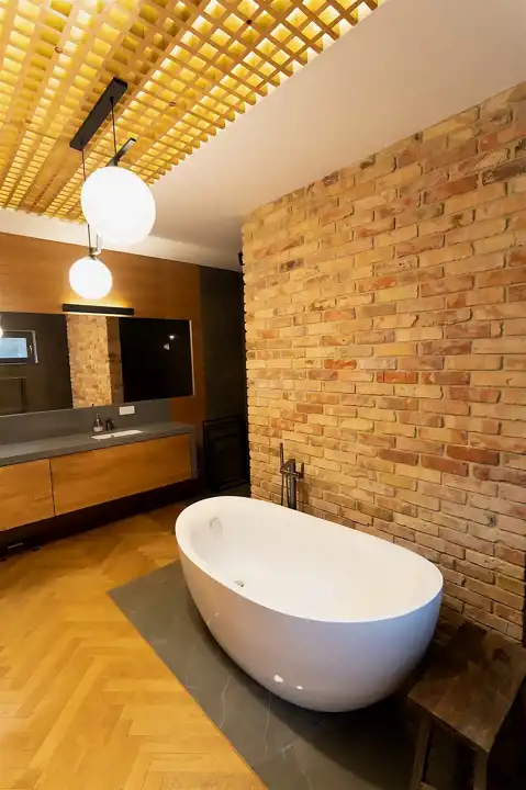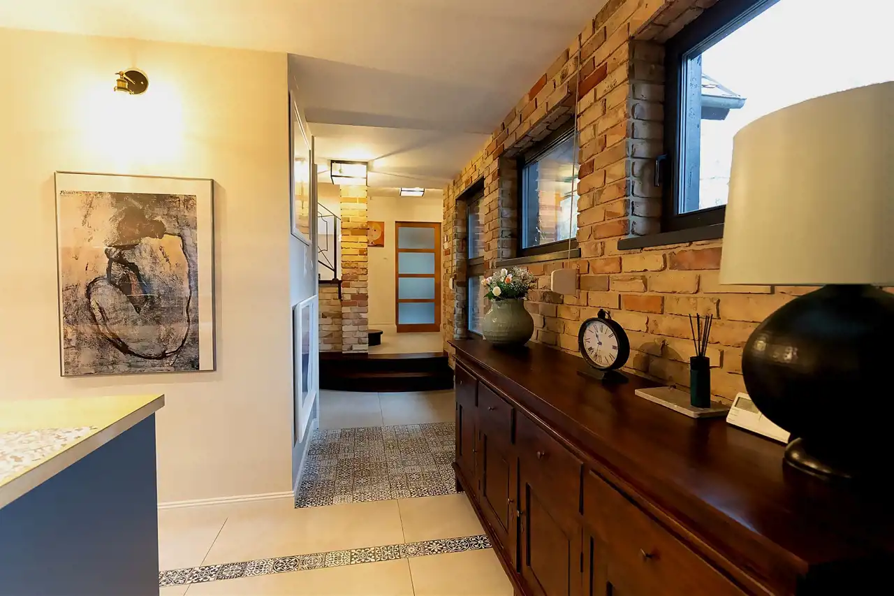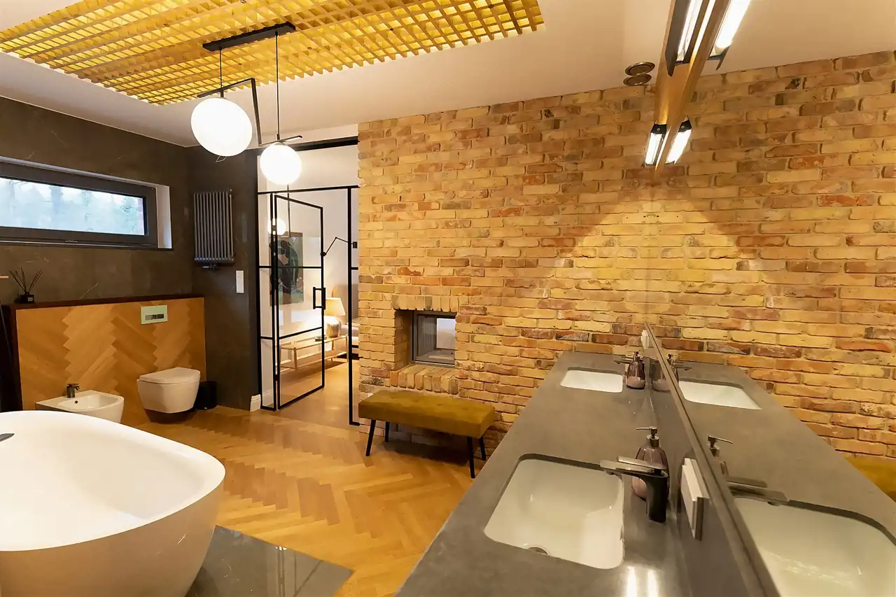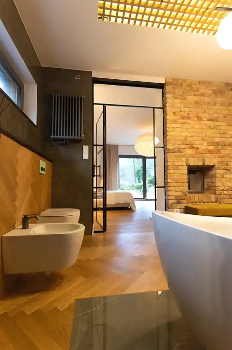 Wnętrza urzekają połączeniem naturalnych materiałów, prostych form i ciepłej kolorystyki. Elementy drewniane, ceglane ściany i miękkie światło tworzą przytulny stylowy klimat.