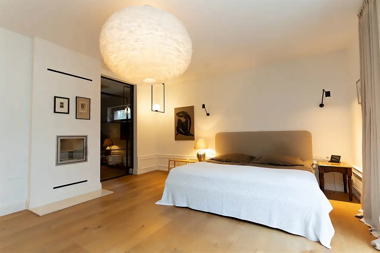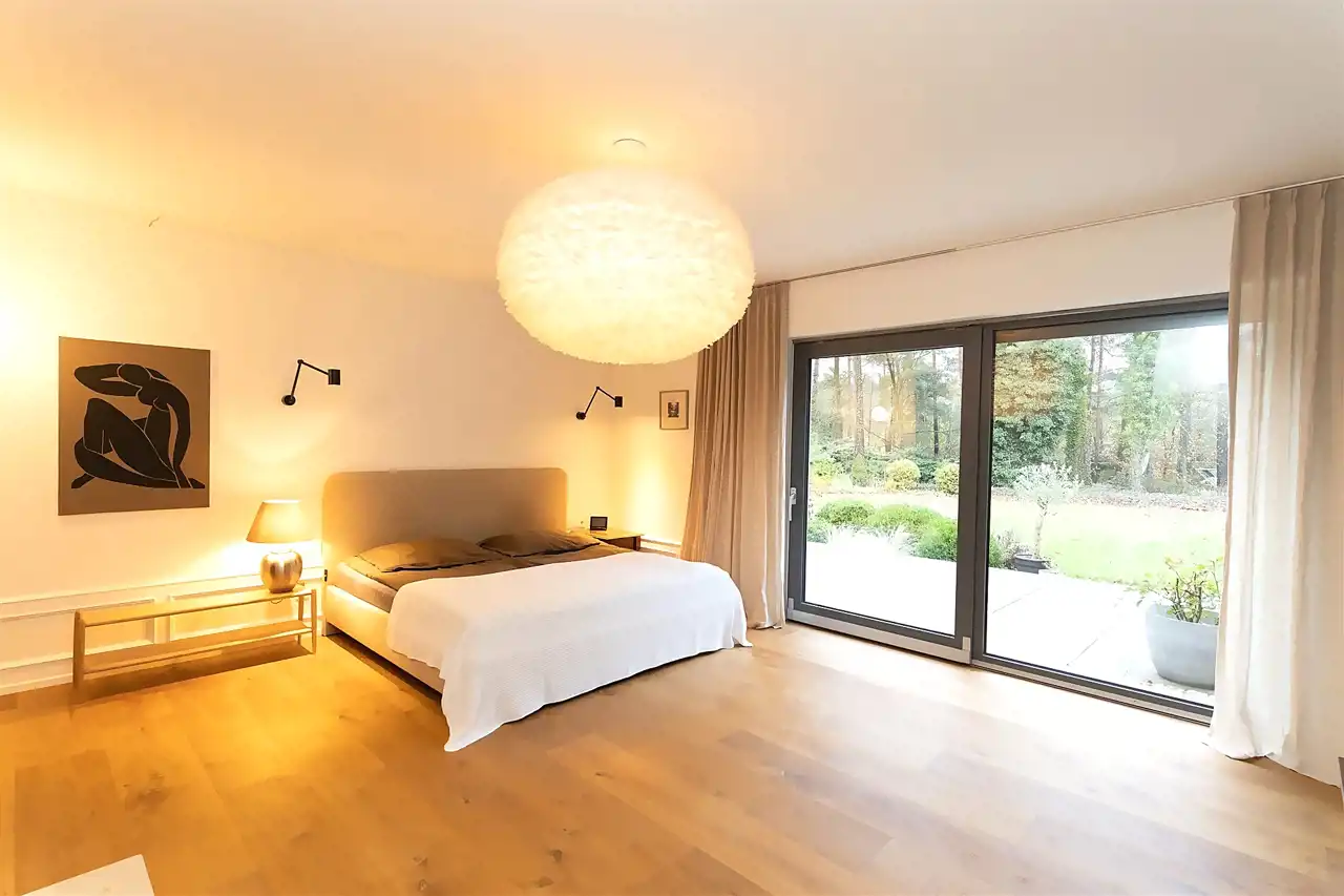 Wyjątkowa sypialnia z pokojem kąpielowym. Duża sypialnia z widokiem na ogród i wyjściem na taras na którym poranili z kawą są wyjątkowe. Pokój kąpielowy z gustowna wanna wolnostojącą i częścią z natryskiem. Pokój kąpielowy z dużymi lustrami, elementami drewna i stylowej cegły.