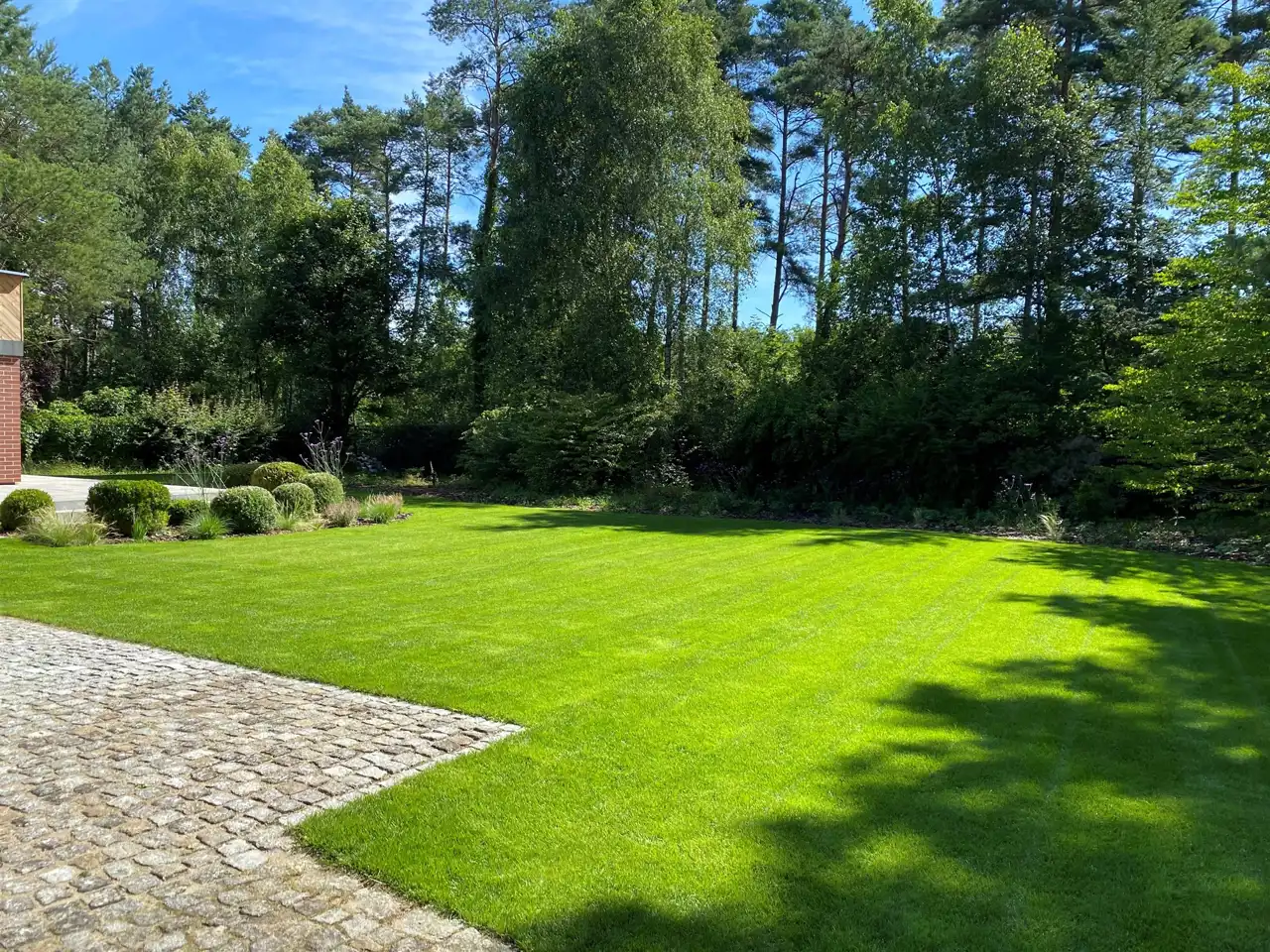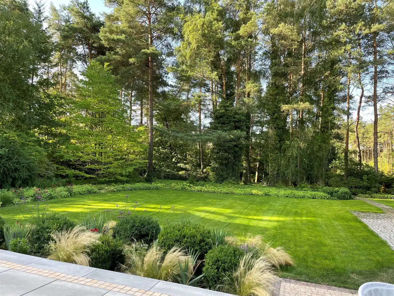 Ogród pełen wieloletnich nasadzeń zachwyca o każdej porze roku – to wymarzone miejsce na poranną kawę, letnie obiady, zabawy z dziećmi czy wieczorne spotkania przy zewnętrznym kominku.