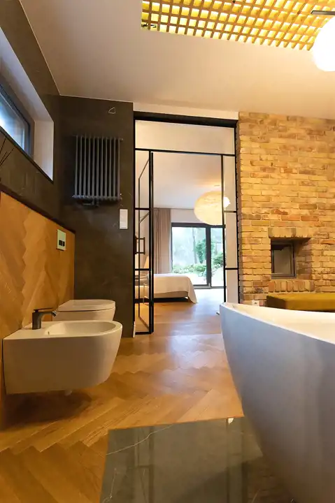 Wyjątkowa sypialnia z pokojem kąpielowym. Duża sypialnia z widokiem na ogród i wyjściem na taras na którym poranili z kawą są wyjątkowe. Pokój kąpielowy z gustowna wanna wolnostojącą i częścią z natryskiem. Pokój kąpielowy z dużymi lustrami, elementami drewna i stylowej cegły