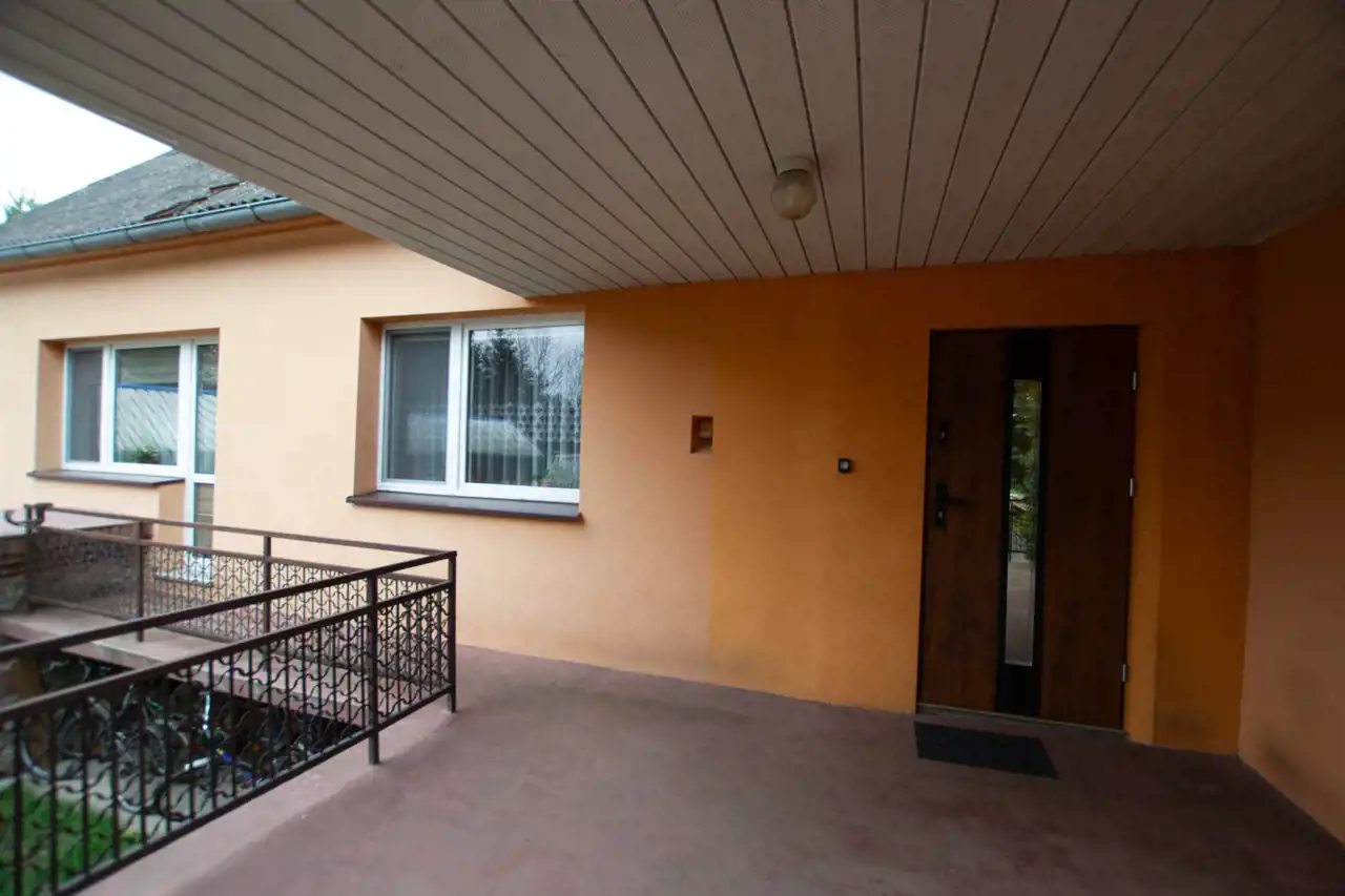Przy wejściu do domu jest duży taras.