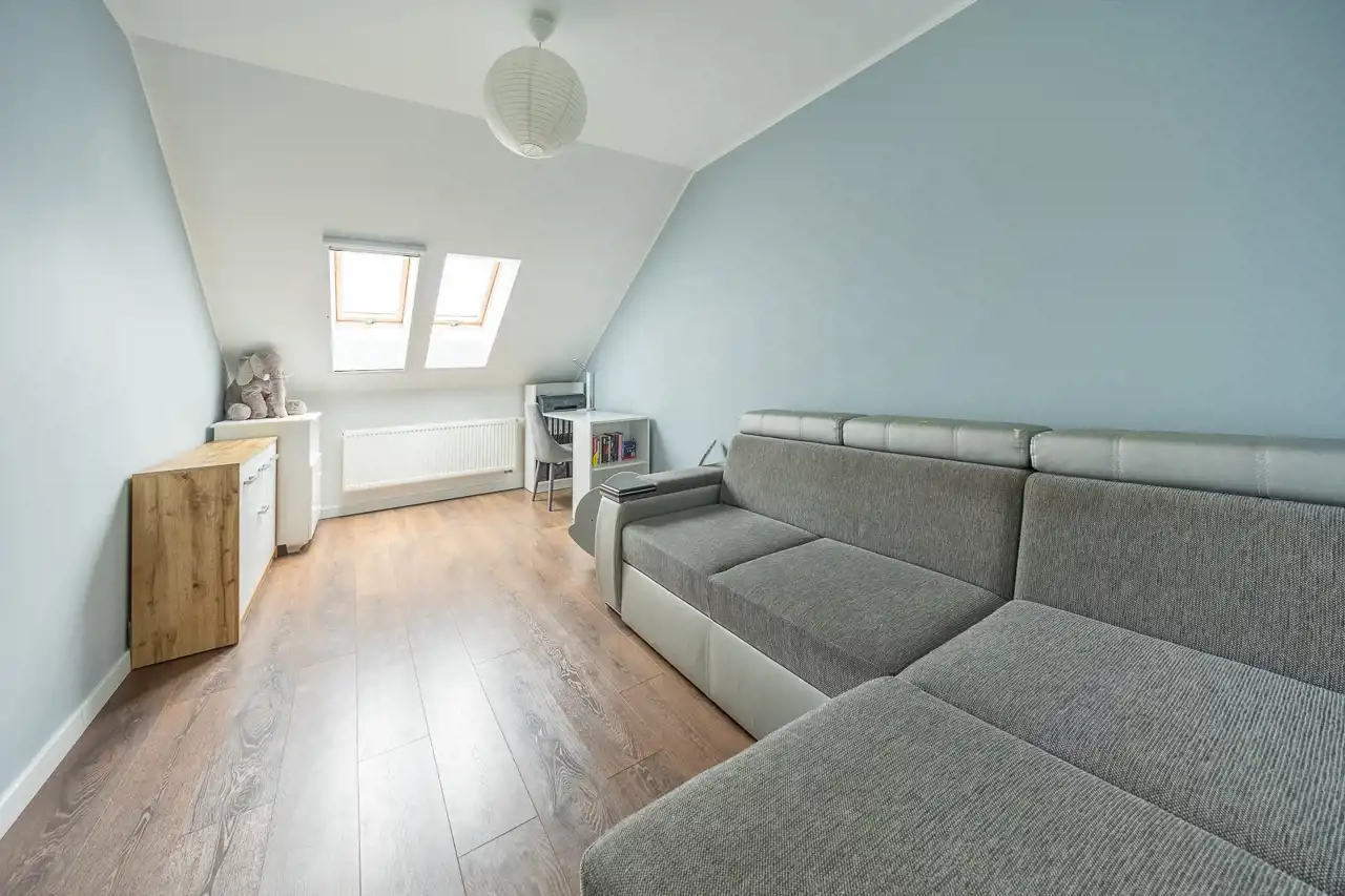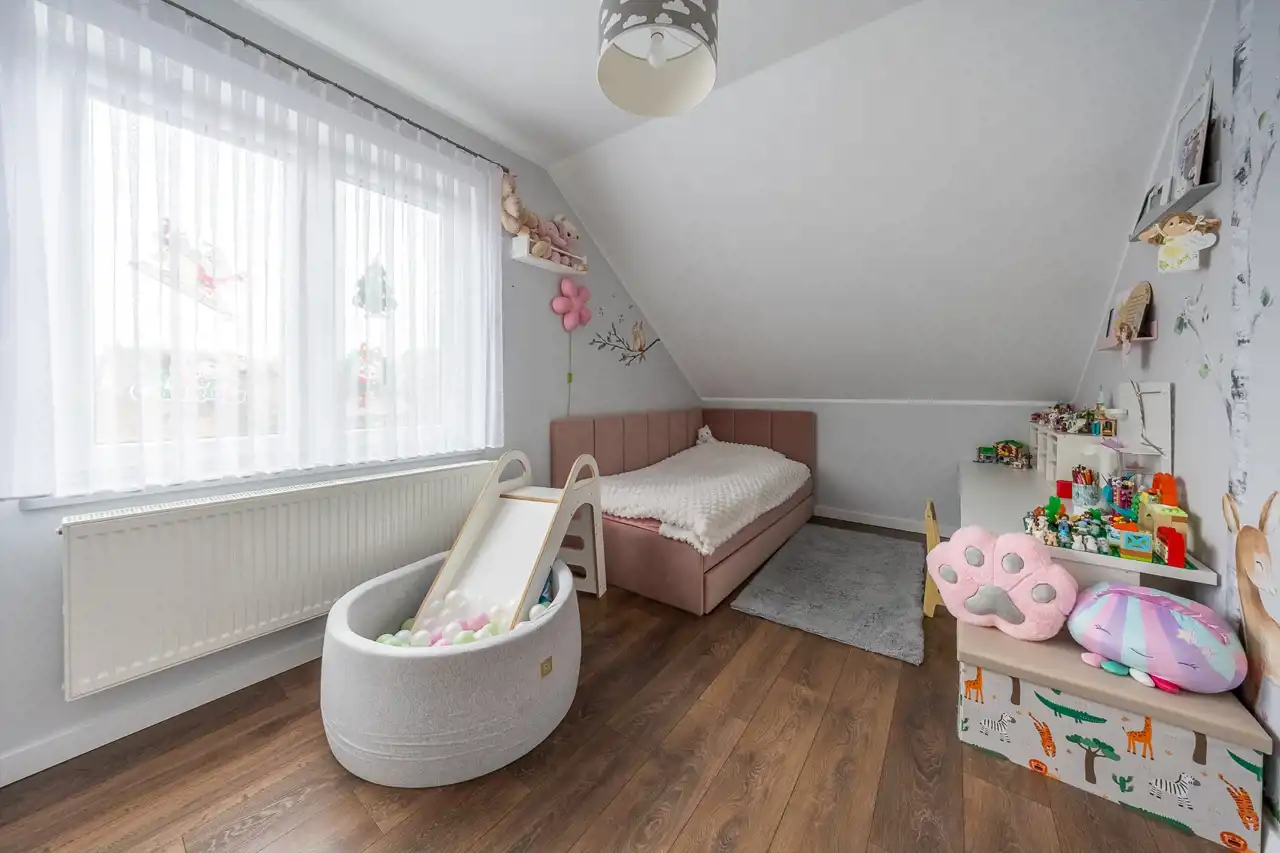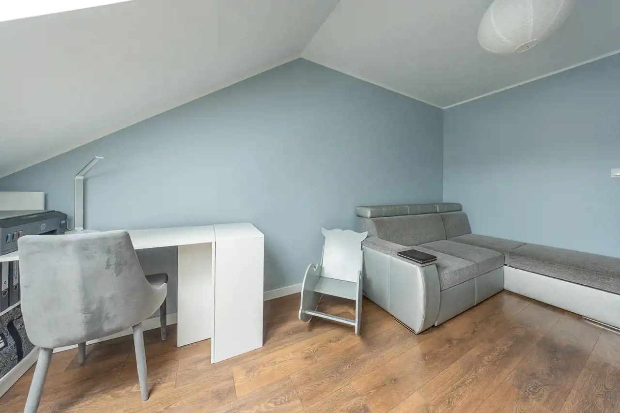 Piętro stanowi prywatną strefę domowników – komfortową, dobrze rozplanowaną i zapewniającą swobodę aranżacji. Przestronna łazienka pozwala na wybór pomiędzy szybkim prysznicem a relaksującą kąpielą po długim dniu.