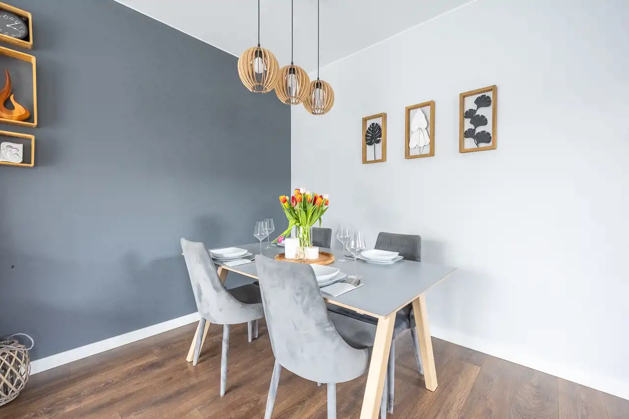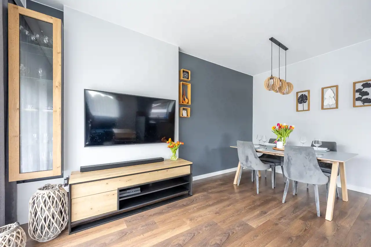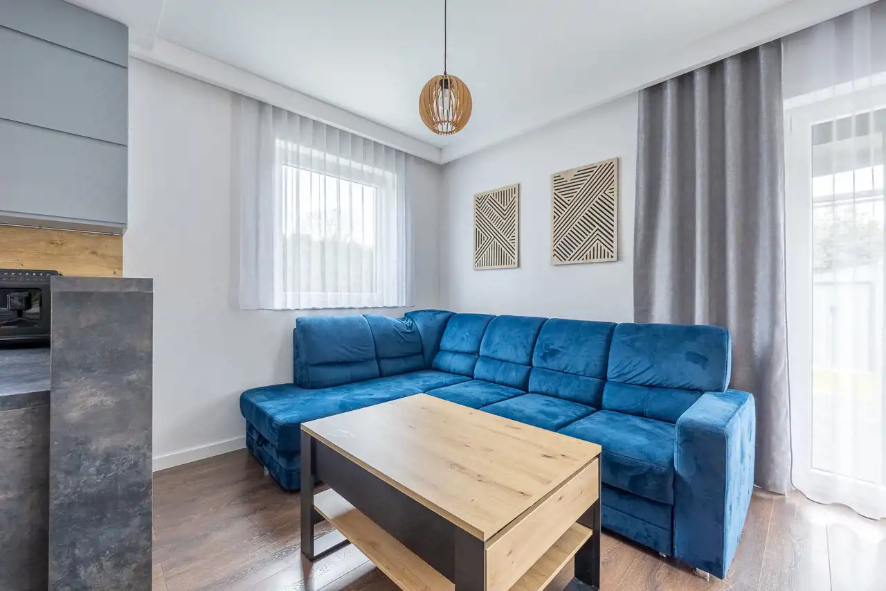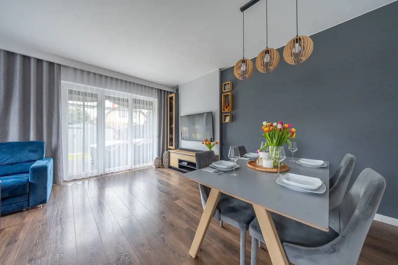 Już od progu wyczuwalna jest harmonia pomiędzy częścią dzienną a prywatną. Naturalne światło swobodnie wypełnia salon, podkreślając przytulny charakter wnętrza i otwierając przestrzeń na ogród – idealne miejsce na poranną kawę, letnie kolacje czy bezpieczną zabawę dzieci.
