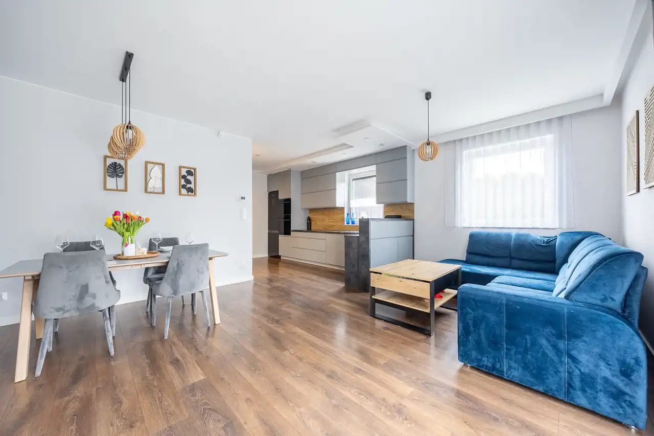 Strefa dzienna tworzy spójną, komfortową przestrzeń do życia. Otwarta kuchnia z zabudową w cenie sprzyja wspólnemu gotowaniu i spotkaniom przy stole, a praktyczne pomieszczenie gospodarcze pozwala zachować ład i porządek.