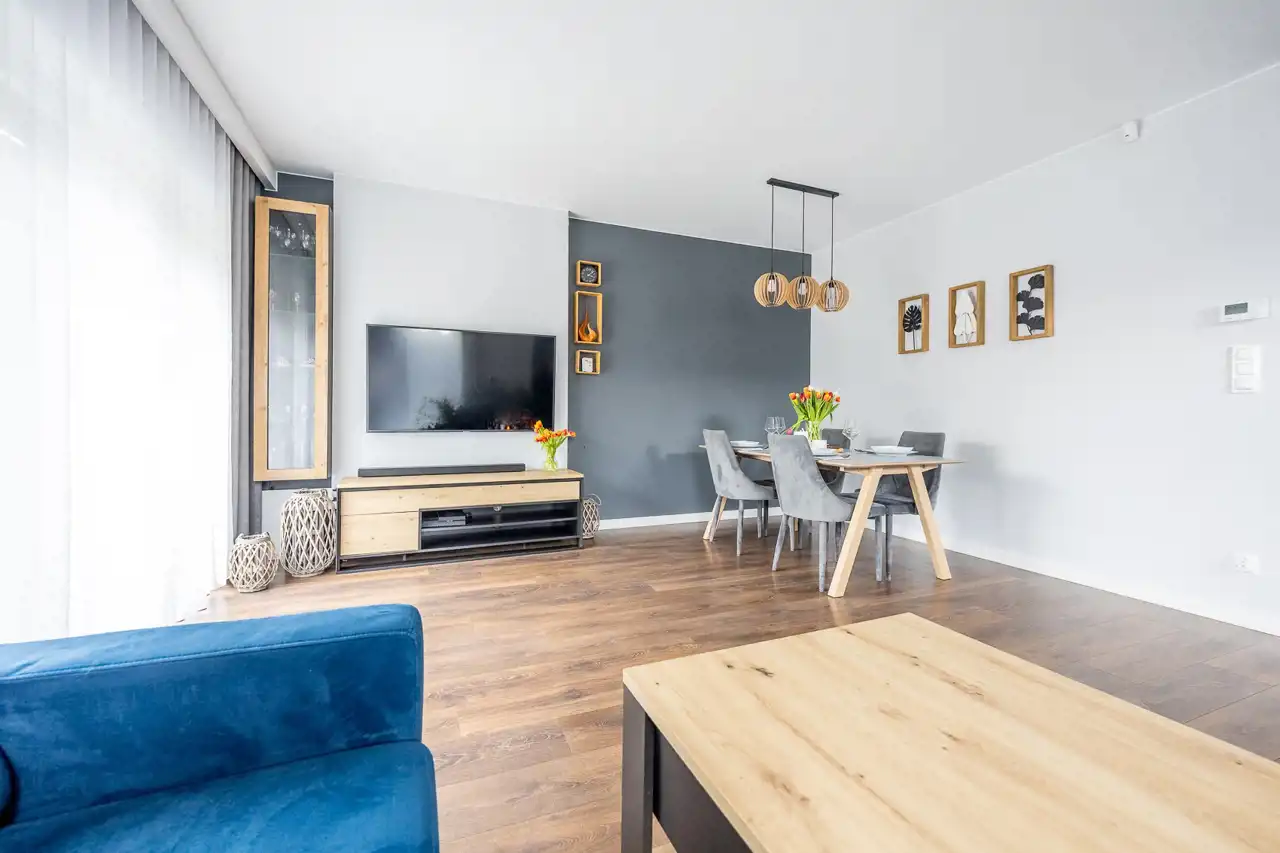 - przestronny salon z aneksem kuchennym i wyjściem do ogrodu
