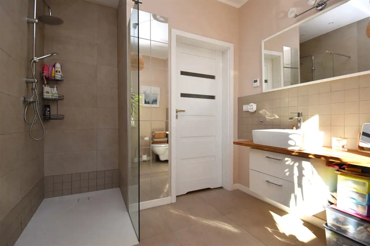 - komfortowa łazienka (7,10 m²) z oknem, natryskiem i miejscem na wannę — przestrzeń gotowa na aranżację w stylu domowego SPA