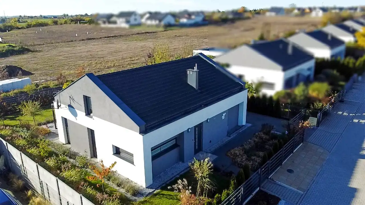 Dom parterowy o przemyślanym i funkcjonalnym układzie pomieszczeń z praktycznym poddaszem (z funkcją przechowywania, częściowo wyłożonym płytą OSB – po którym można swobodnie chodzić, możliwość podłączenia ogrzewania):