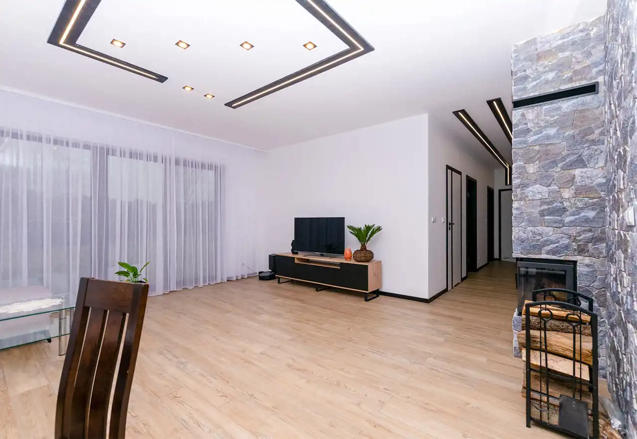 - salon z jadalnią (28,92 m2) wyposażony w kominek narożny (kratki.pl) z rozprowadzeniem grawitacyjnym ciepła na 3 pokoje, obłożony wysokiej klasy kamieniem betonowym, duże 4 skrzydłowe okno prowadzące na taras (2 skrzydła uchylno-rozwiewne, 2 stałe),