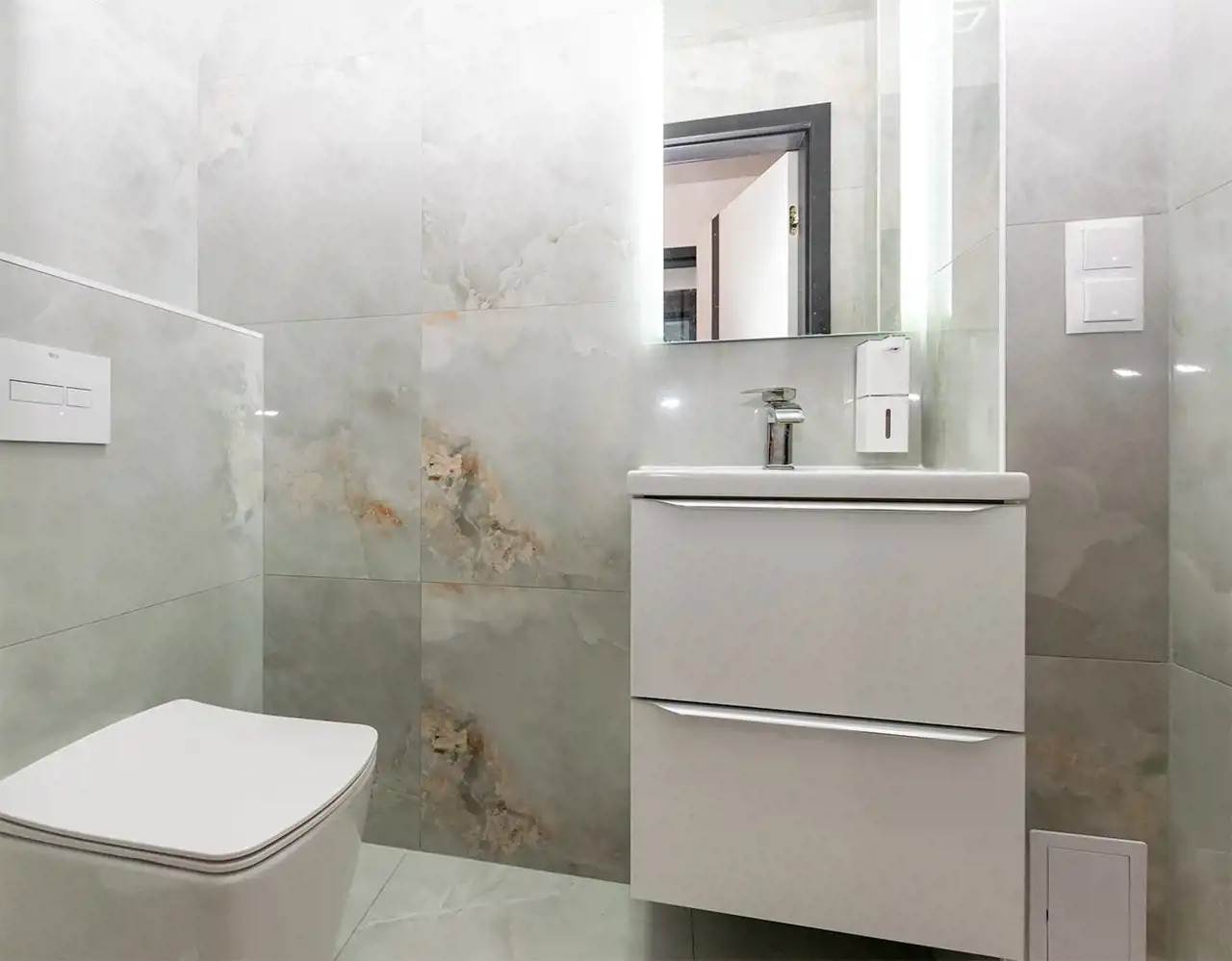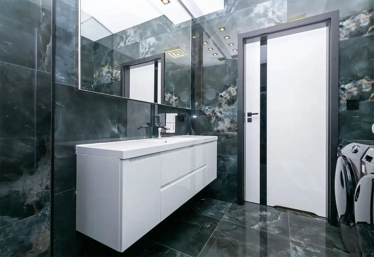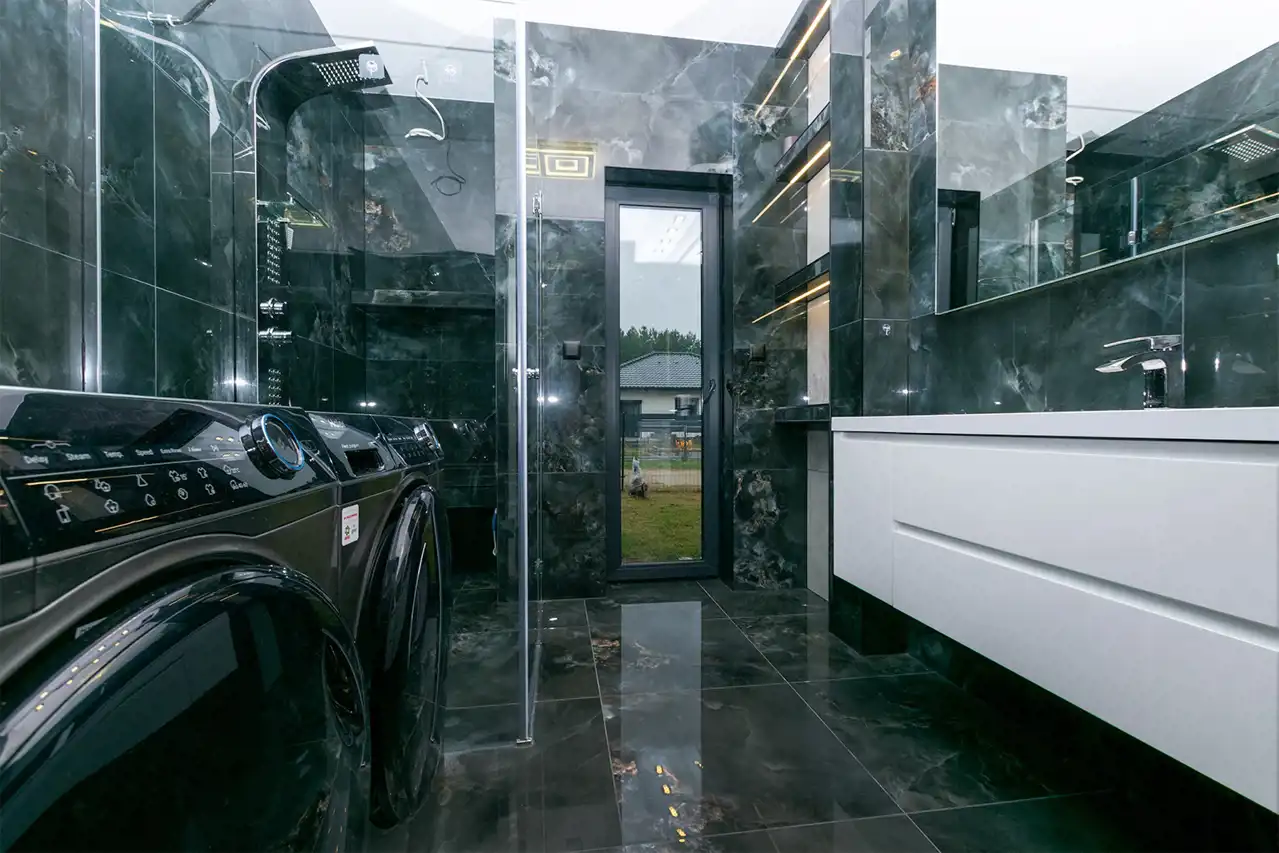 - łazienka (6,58 m2) wyposażona w prysznic ze szkła 8 mm z powłoką hydrofobową o wymiarach 120x100 z odpływem liniowym wraz panelem prysznicowym i deszczownicą Brise, podświetlane lustro i półki, w cenie pralka i suszarka Haier,