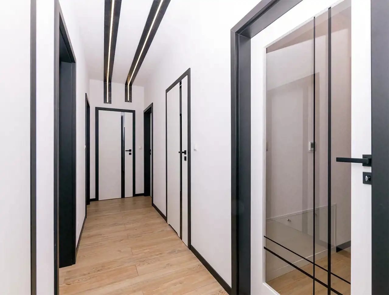 - w całym domu zamontowano drzwi bezprzylgowe, magnetyczne z ukrytymi zawiasami,