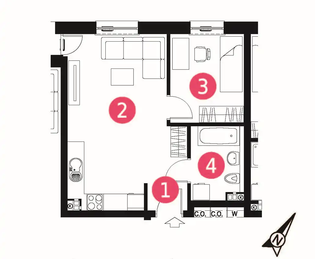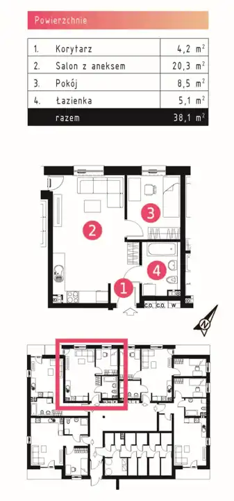- Charakterystyka mieszkania 38.1 m2, 2 pokoje
