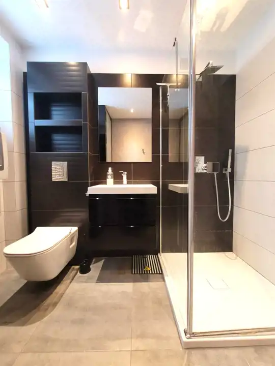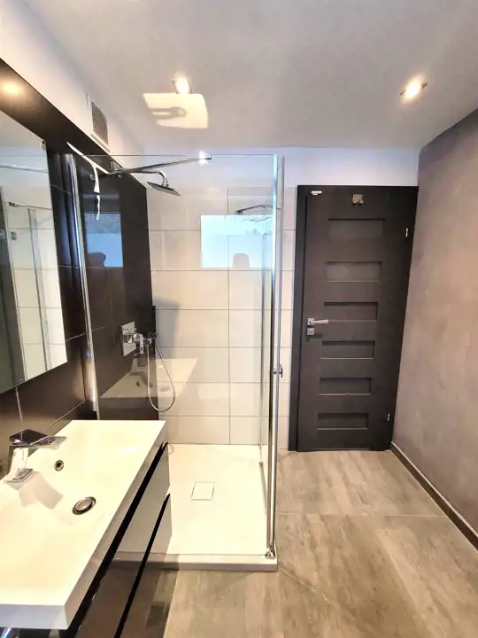 natrysk, umywalka z szafką, lustro, szafa w zabudowie z PRALKĄ
