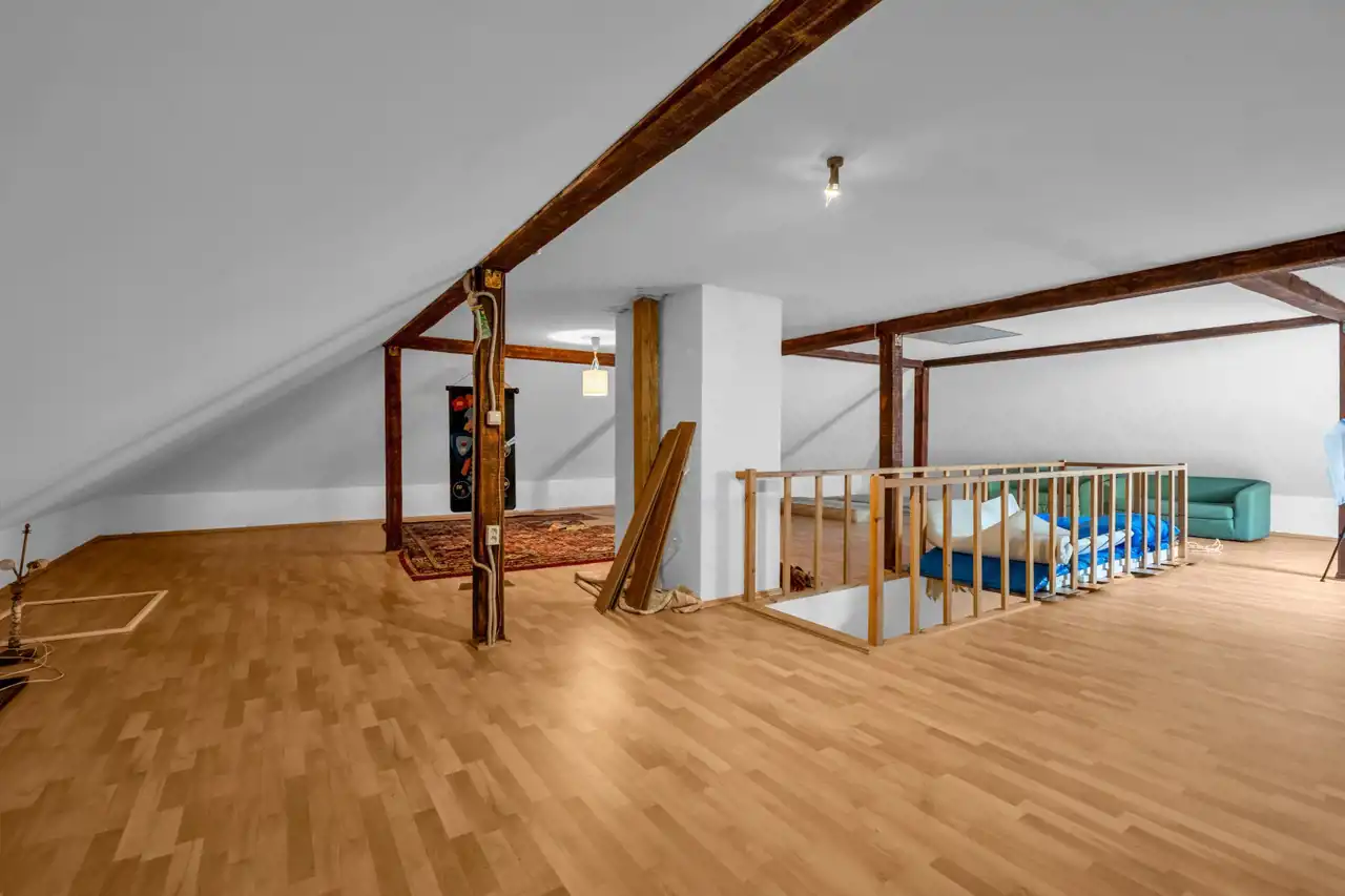 Piętro to otwarta, wykończona przestrzeń z jednym oknem dachowym nad całym domem, do dowolnego zagospodarowania.