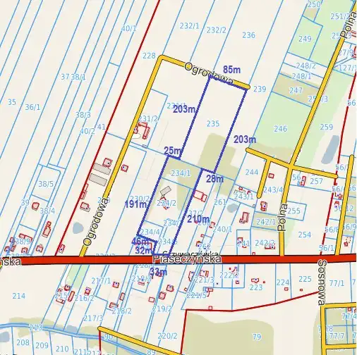 Approximate dimensions of the plot: 80x191x82x210 [m]. Access via asphalt road. A high-pressure gas pipeline runs through part of the plot (15 m). Utilities: gas available in the street approximately 250 m away, electricity and water on the plot. No sewage system.