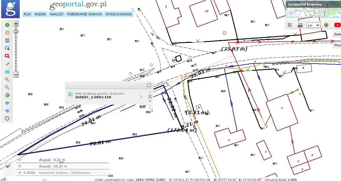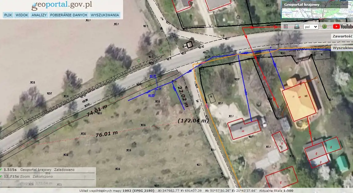 The plot is roughly triangular in shape with dimensions of 74 x 76 x 22 [m]. Access via asphalt road. Utilities: Water supply on the plot; electricity available on the road and neighboring plots; no sewage/gas system.