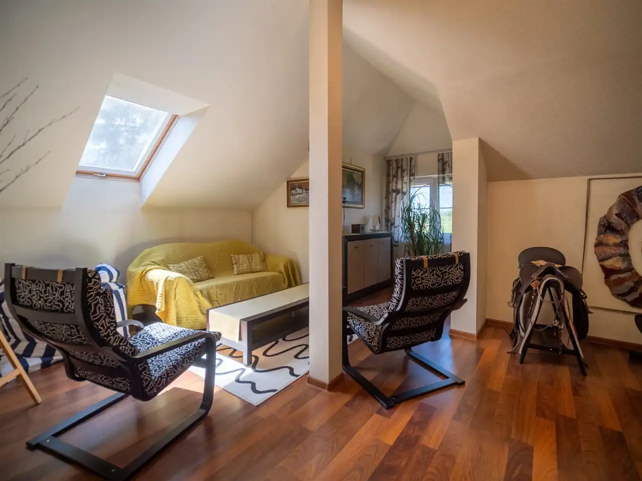- Piętro: Na piętrze znajdą Państwo dużą, otwartą przestrzeń salonową, która może służyć jako strefa relaksu, pokój multimedialny lub dodatkowy salon. Dwie jasne sypialnie, łazienka i duża garderoba zapewniają prywatność i komfort dla domowników lub gości. Dodatkowo na piętrze znajduje się duży strych o powierzchni około 150m2 z możliwością adaptacji na części mieszkalne.