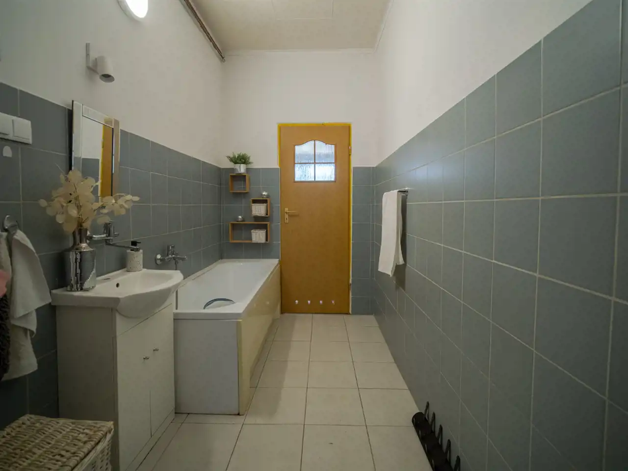 Łazienka: Funkcjonalna, wyłożona płytkami, z wanną.