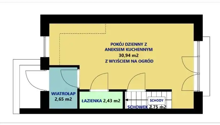 Parter-wiatrołap, salon z tarasem i aneksem kuchennym, łazienka, schowek