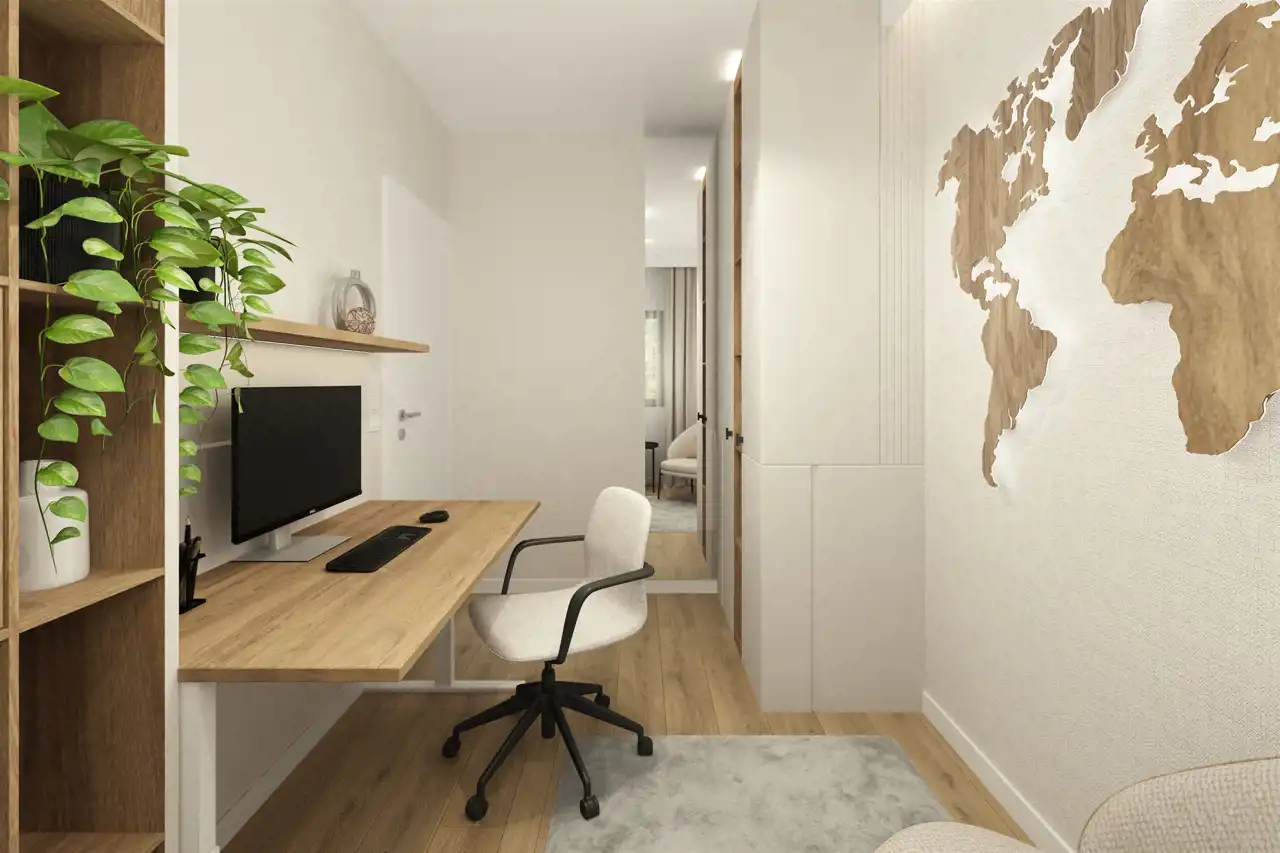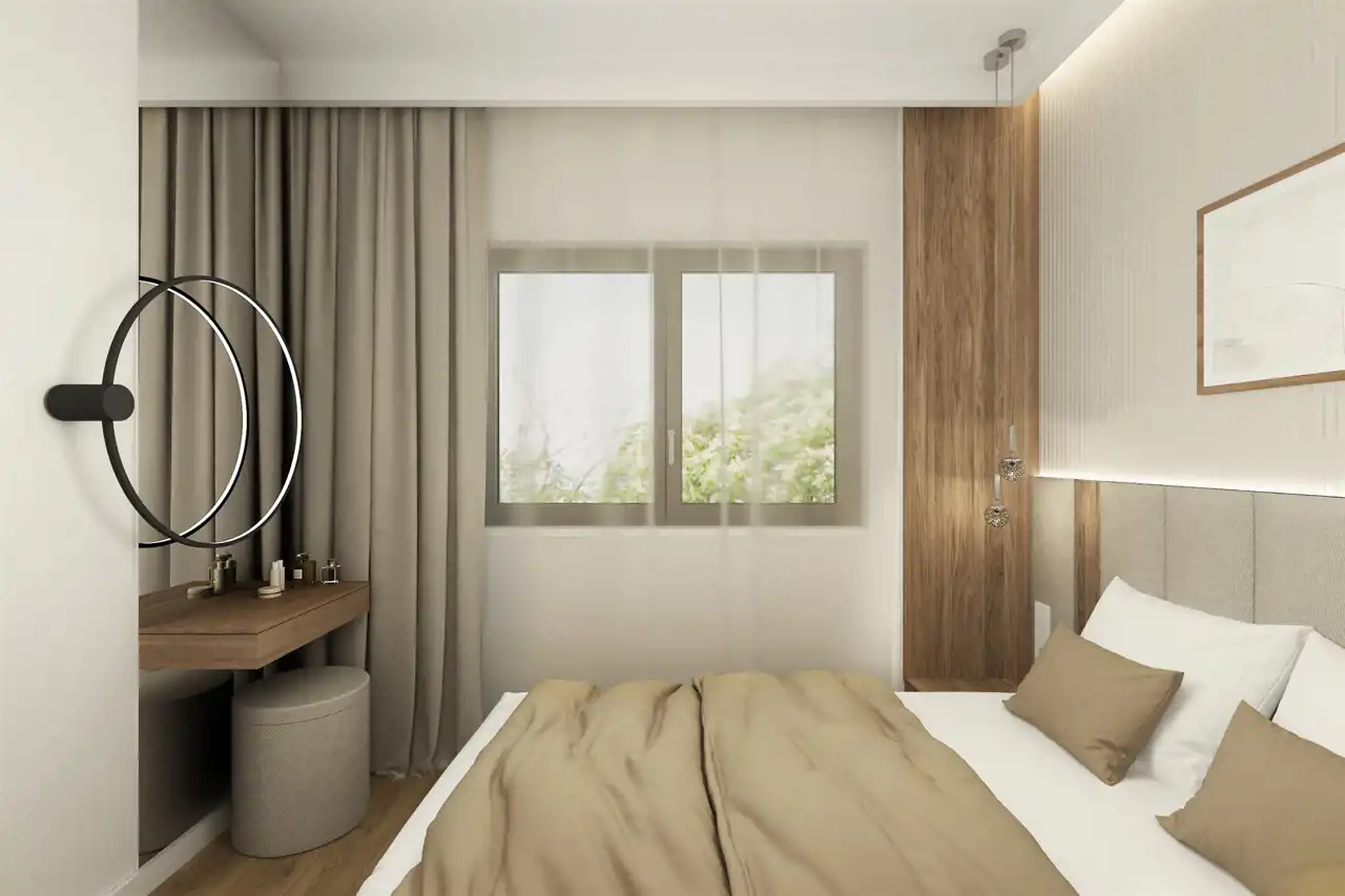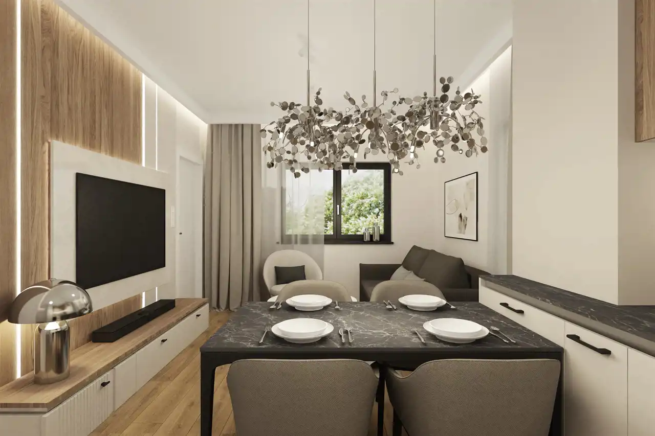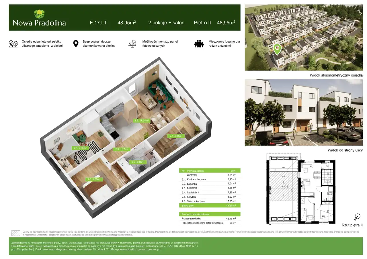 Przykładowe mieszkanie F.17.I. ma powierzchnię 48,95 m2 i znajduje się na drugim piętrze. Lokal składa się z salonu i aneksu kuchennego, dwóch pokoi oraz łazienki. Wystawa okienna w stronę południową z dużym tarasem o powierzchni 42,46m2.
