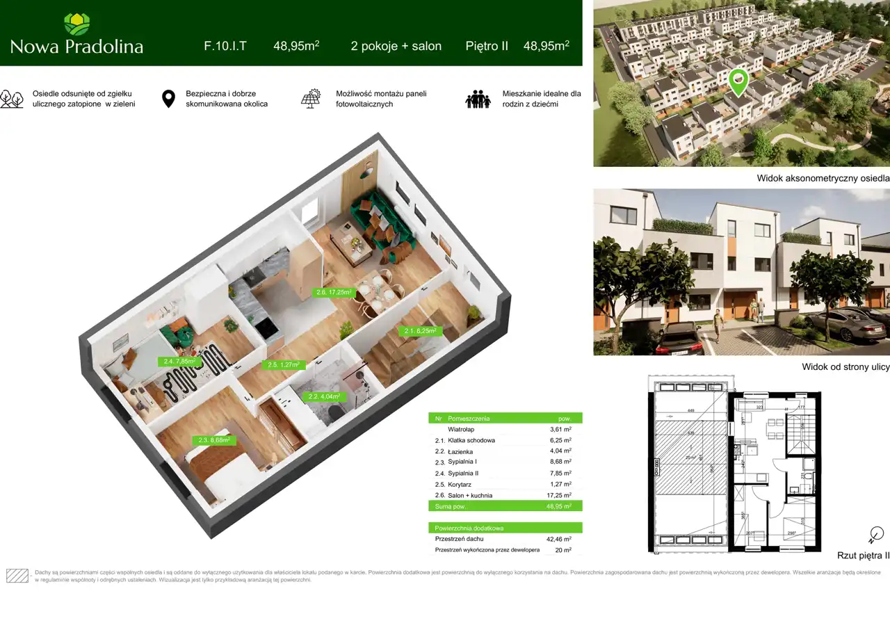 - Nowoczesne, ogrodzone i monitorowane osiedle z oświetleniem i strefą rekreacyjną nad strumieniem