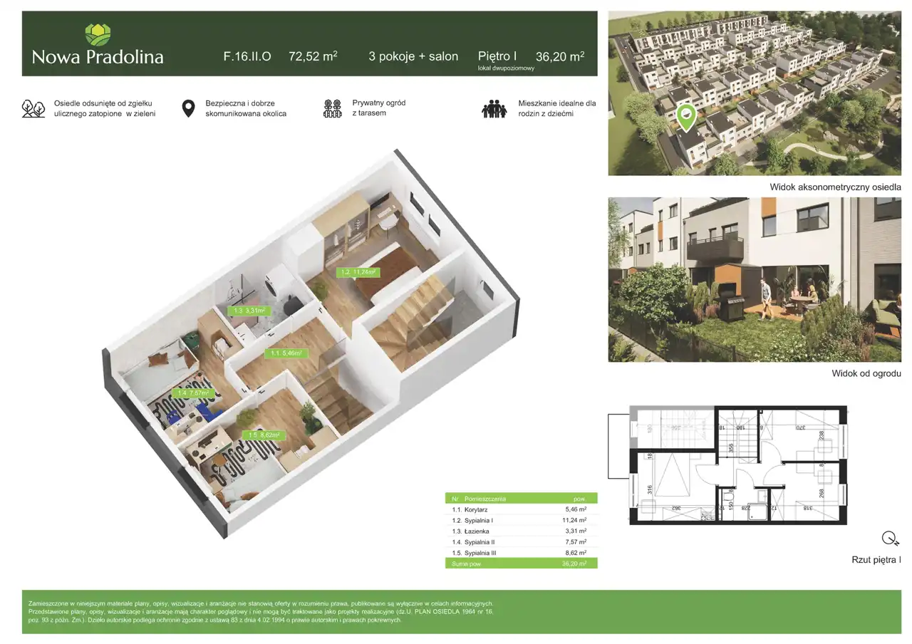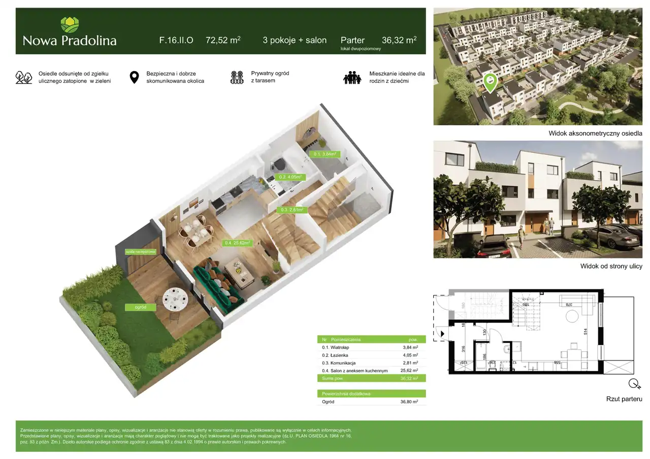 Przykładowe dwupoziomowe mieszkanie F.16.II.O ma powierzchnię 72,52 m2 i znajduje się na parterze. Lokal składa się z salonu i aneksu kuchennego, trzech pokoi oraz dwóch łazienek. Wystawa okienna w stronę północną i południową z ogródkiem o powierzchni 36,8m2.