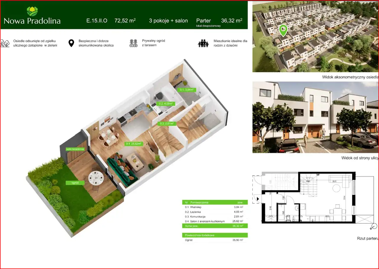 Prezentowane mieszkanie to przestronne, 2 poziomowe, 4 pokojowe mieszkanie na parterze i 1 piętrze o pow. 72,52 m2 z ogródkiem o pow. 35,90 m2. Na poziomie parteru znajduje się salon z aneksem kuchennym o pow. 25,62 m2, łazienka (4,05 m2) oraz wiatrołap i przedpokój. W ogródku komórka narzędziowa. Na 1 piętrze znajdują się 3 pokoje (11,24 m2; 8,62 m2 i 7,57 m2), łazienka (3,31 m2) oraz przedpokój.