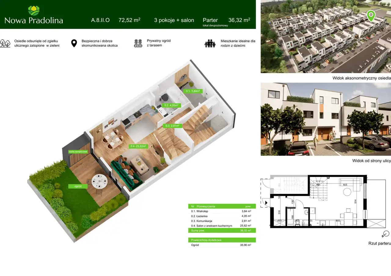 Prezentowane mieszkanie to przestronne, 2 poziomowe, 4 pokojowe mieszkanie na parterze i 1 piętrze o pow. 72,52 m2 z ogródkiem o pow. 35,90 m2.