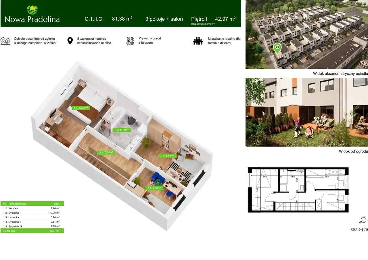 – Trzy sypialnie: 12,25 m², 9,61 m², 7,13 m²