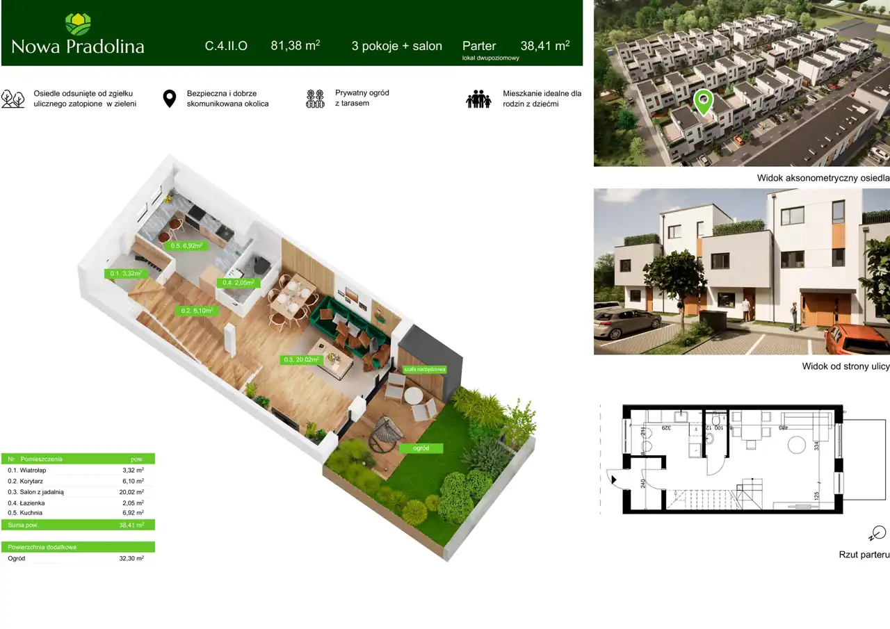 Na sprzedaż przestronne, dwupoziomowe mieszkanie o powierzchni 81,38 m² z prywatnym ogródkiem 32,30 m². Lokal znajduje się na parterze i 1. piętrze nowoczesnego osiedla „Nowa Pradolina” w Tarnowie