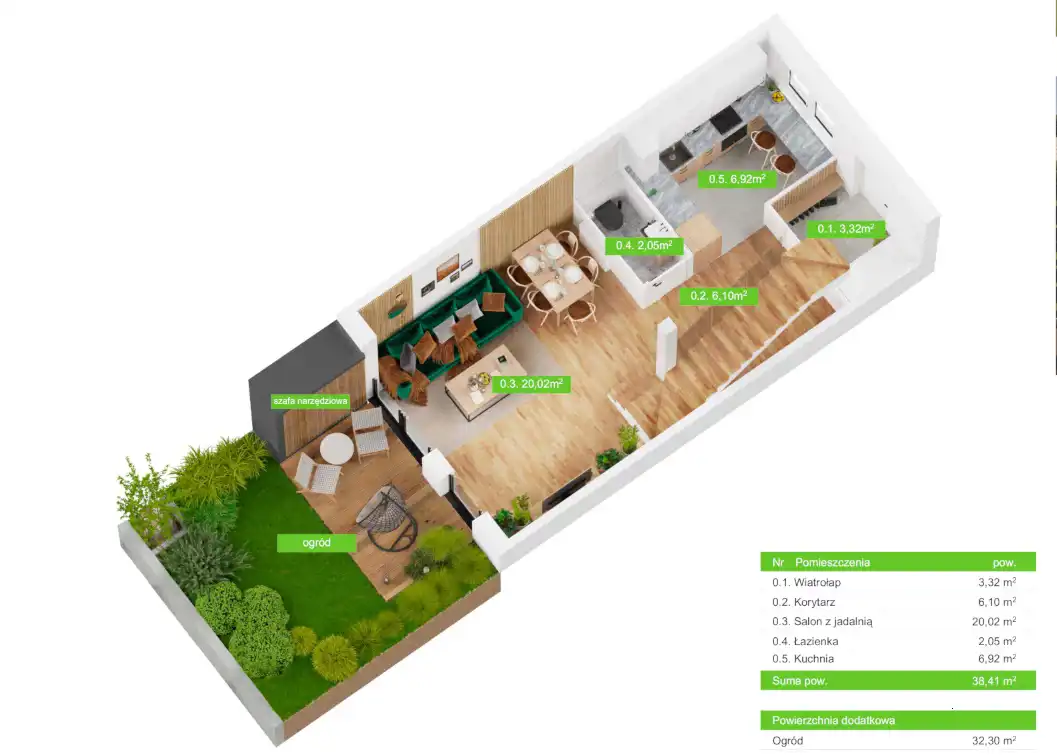 Na sprzedaż oferujemy przestronne, dwupoziomowe mieszkanie o powierzchni 81,38 m², z prywatnym ogródkiem 32,30 m². Lokal znajduje się na parterze i 1. piętrze nowoczesnego osiedla „Nowa Pradolina” w Tarnowie. Ogródek z komórką narzędziową to idealna przestrzeń do relaksu, zabawy z dziećmi oraz spotkań z rodziną i przyjaciółmi.Układ pomieszczeń: