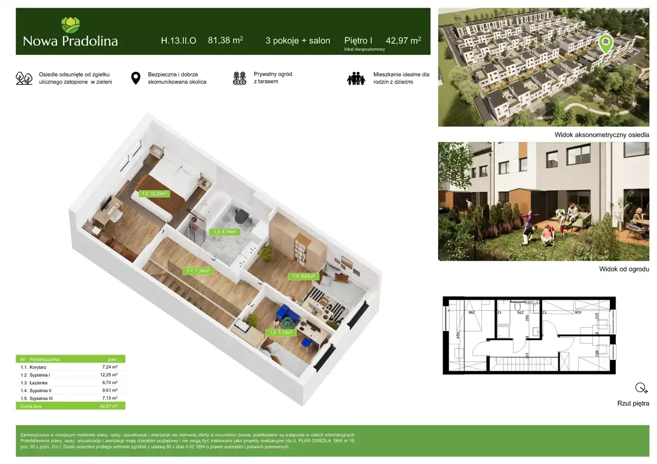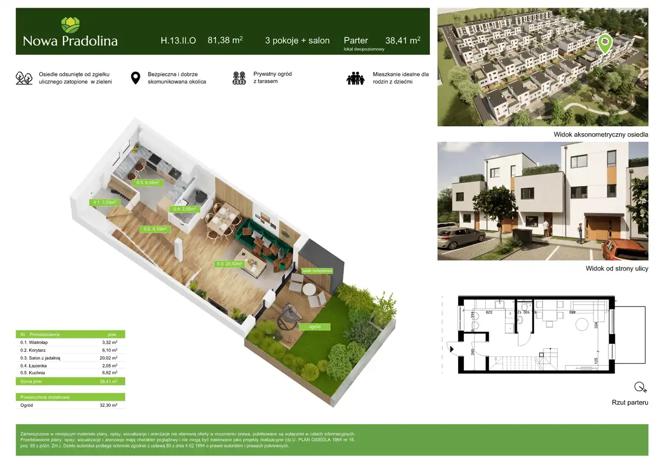 Przykładowe dwupoziomowe mieszkanie H.13.II.O ma powierzchnię 81,38 m2 i znajduje się na parterze. Lokal składa się z salonu i aneksu kuchennego, trzech pokoi oraz dwóch łazienek. Wystawa okienna w stronę północną i południową z ogródkiem o powierzchni 32,3m2.