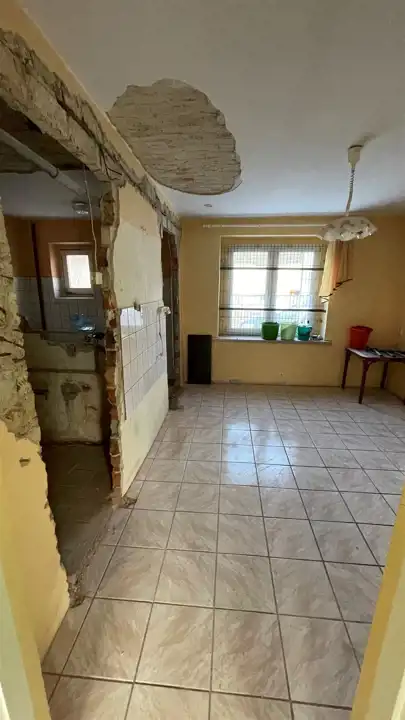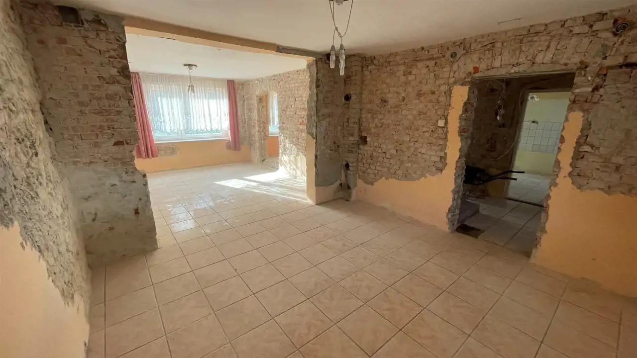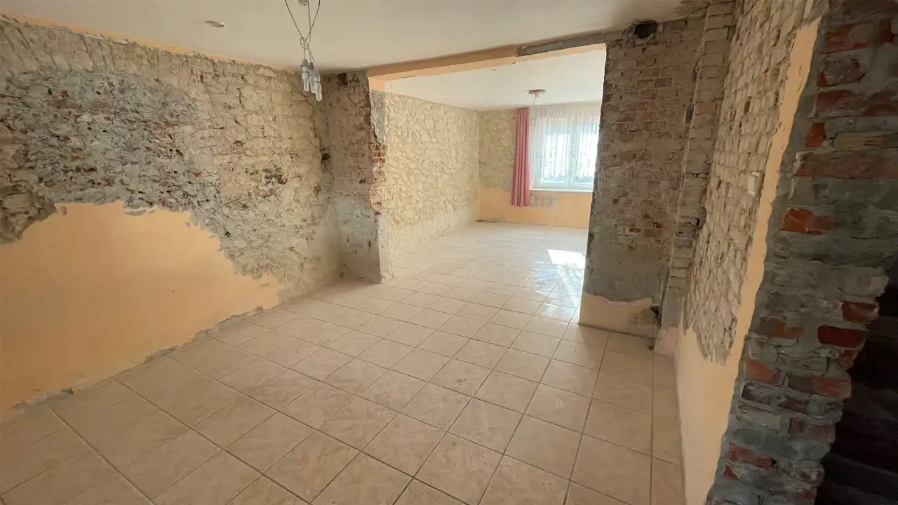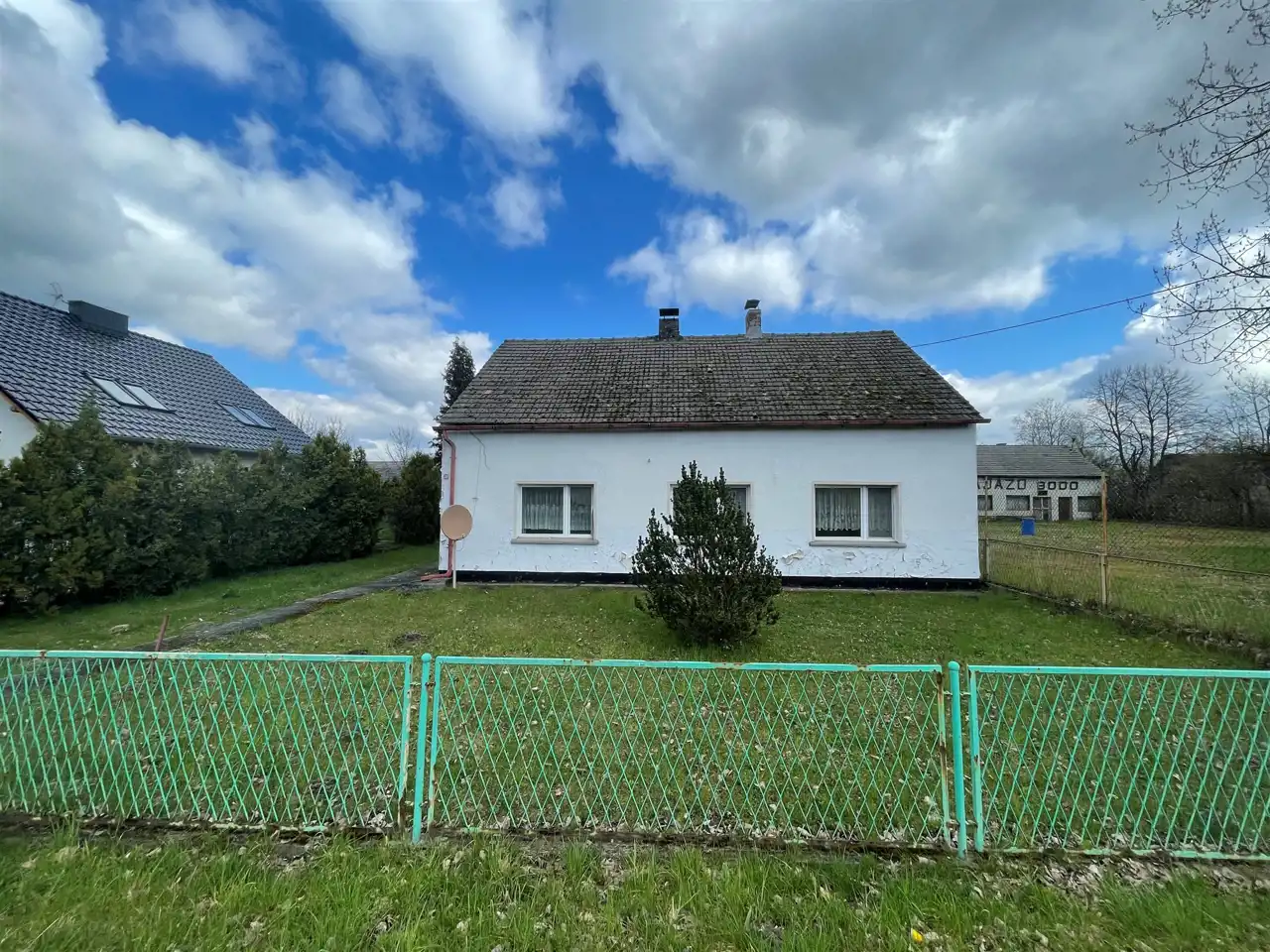 Budynek jednokondygnacyjny, w trakcie remontu (częściowo skute stare tynki, wyburzona ścianka działowa) z oknami o profilach PCV, dachem dwu spadowym krytym dachówką cementową. Nieruchomość składa się z trzech pokoi, kuchni, łazienki oraz. Wysokie poddasze oraz budynki gospodarcze do zagospodarowania. W cenie nieruchomości znajduje się dachówka ceramiczna oraz niezbędny materiał do remontu dachu. Media: prąd, woda, gaz (wydana decyzja o przyłączeniu, planowane przyłączenie luty 2024), szambo na posesji