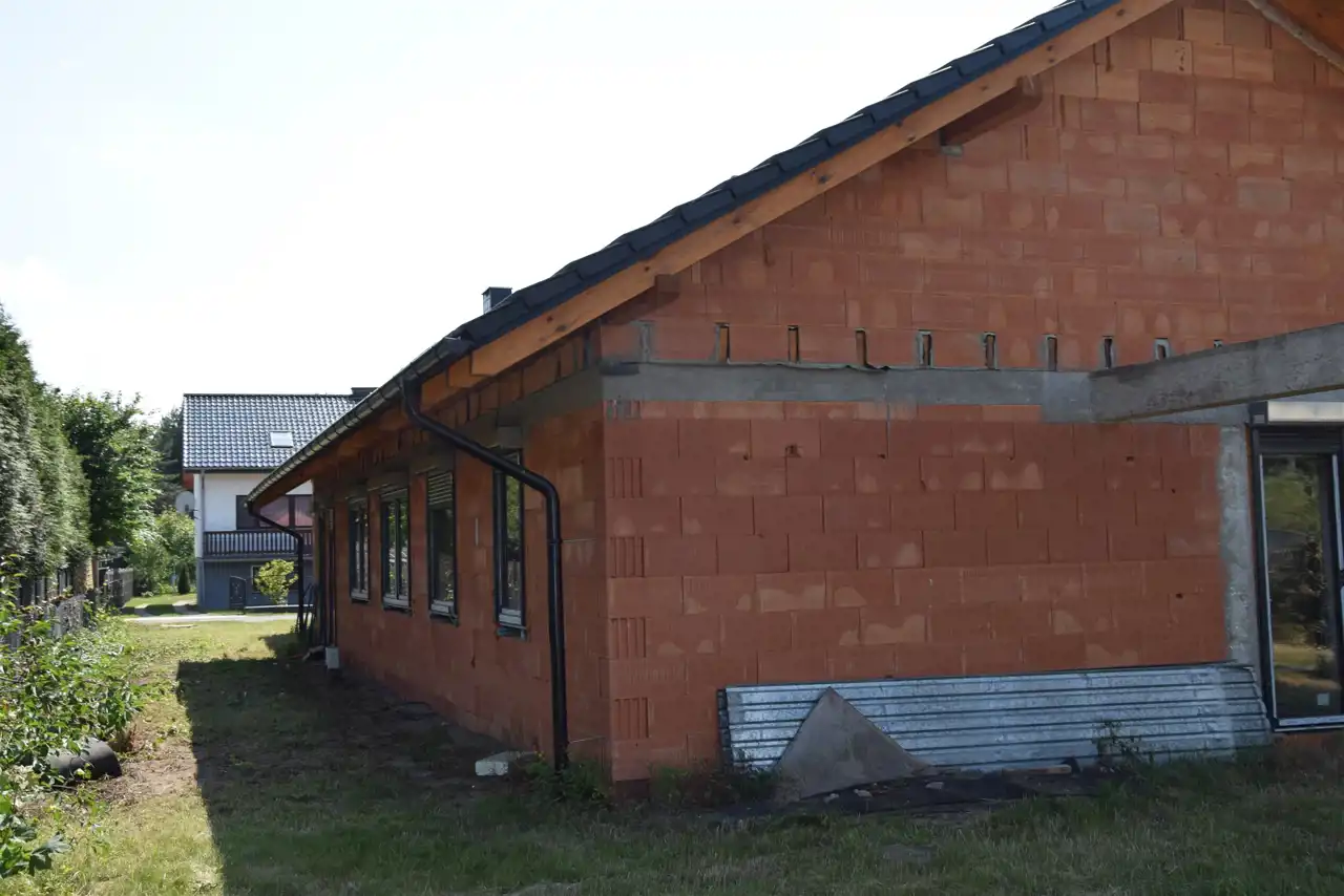 Budynek do sprzedaży zrealizowany w stanie surowym zamkniętym. Powierzchnia domu to ok 165 m2 wraz z garażem na dwa stanowiska o pow. 38 m2, może być powiększona o użytkowe poddasze, (jest przewidziane miejsce na klatkę schodową).